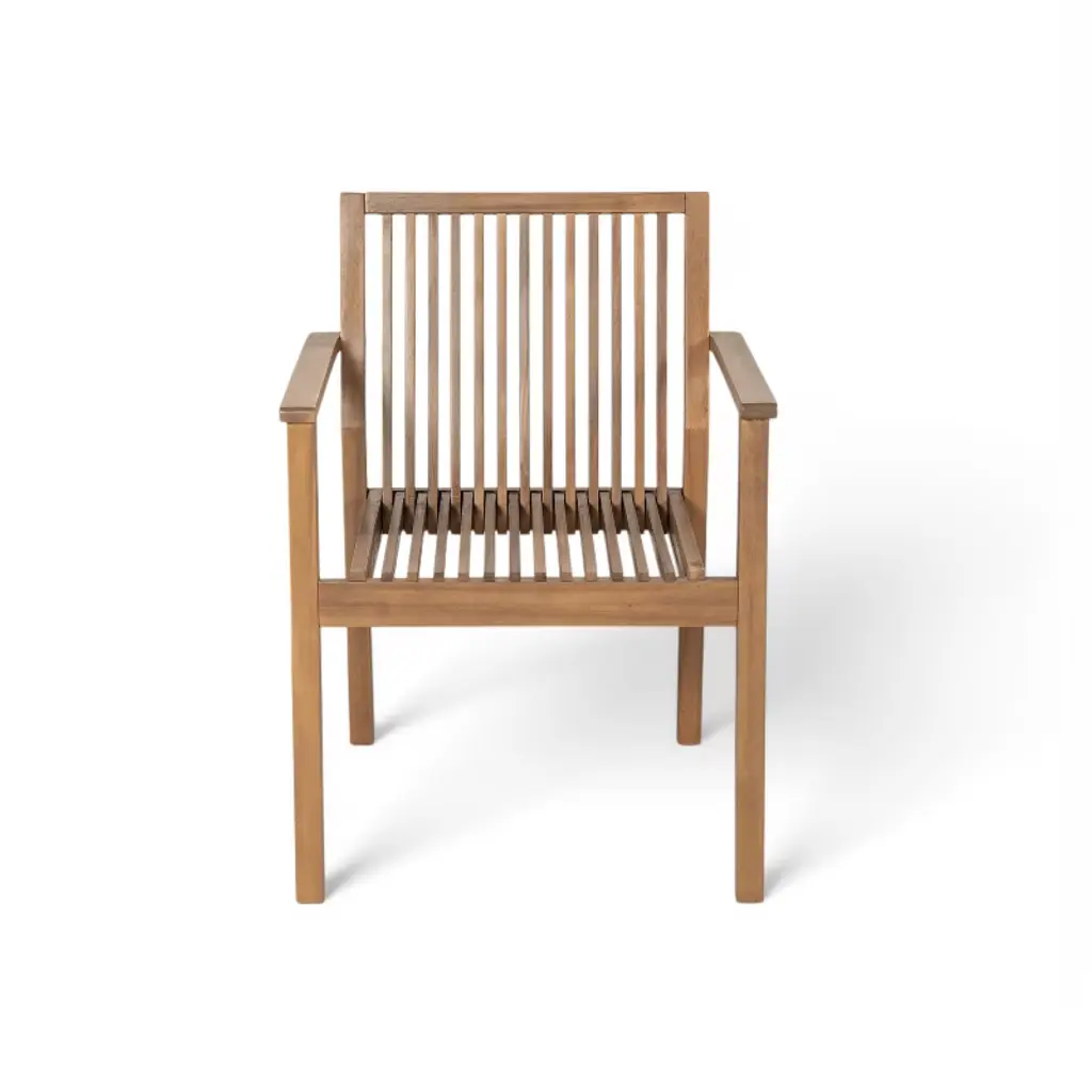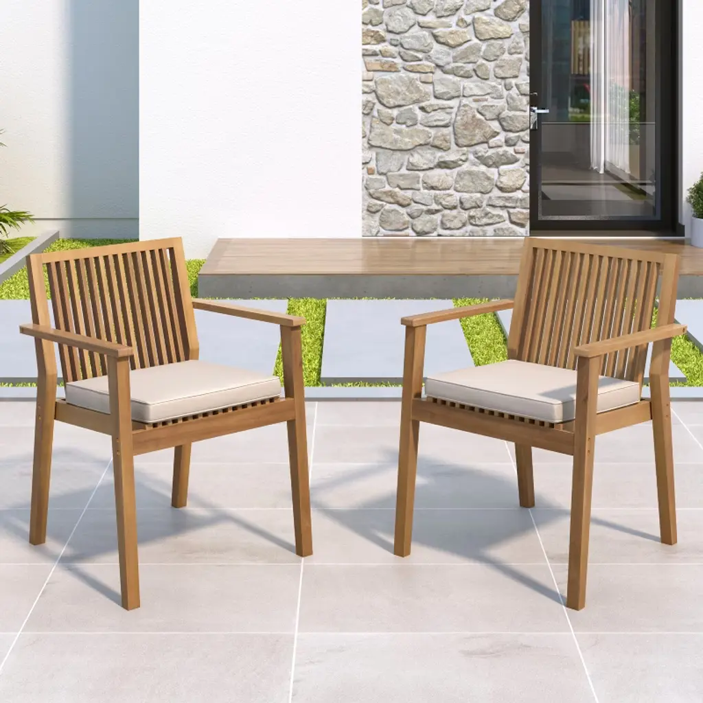 Sturdy Acacia Wood Frame: Crafted with durable acacia wood, ensuring long-lasting use for outdoor dining. Can bear up to 400 lbs per chair. Waterproof & Washable Cushions: Seat cushions feature waterproof fabric and foam filling. Removable covers for easy cleaning, keeping them fresh. Comfortable Design: The ergonomic structure with armrests provides cozy seating. Ideal for outdoor meals, chats, and relaxation. 2-Piece Set Value: Comes as a pair, perfect for couples or small gatherings. Instantly upgrade your outdoor dining space. Easy Assembly & Maintenance: Simple to put together. The wood frame requires minimal care; cushions are easy to clean and maintain. Proper Size for Versatility: Dimensions 24" W * 23.5"D * 32.5"H fit most outdoor areas, like patios, gardens, and balconies.
