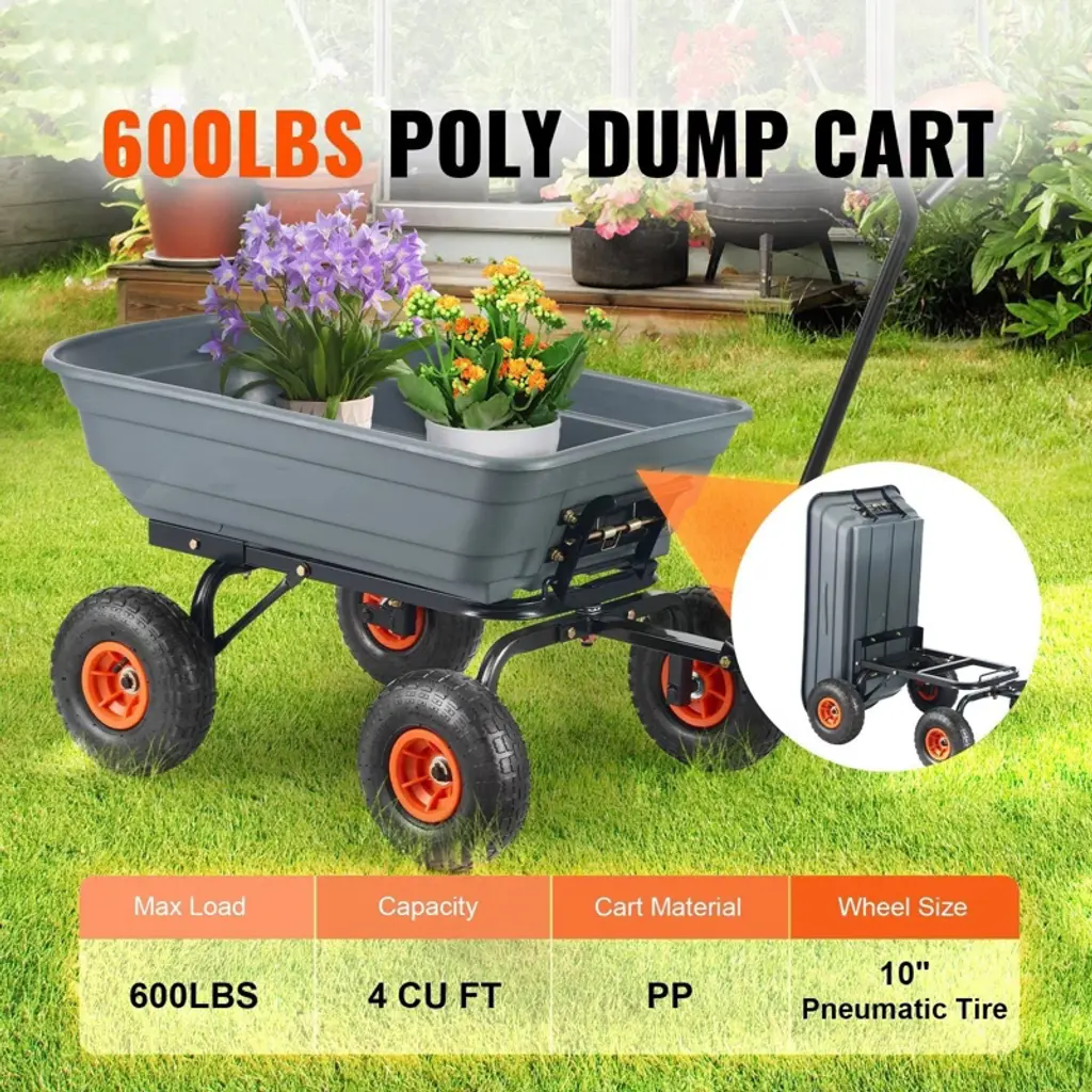 Dump Cart, Poly Garden Dump Cart with Easy to Assemble Steel Frame, Dump Wagon with 2-in-1 Convertible Handle, Utility Wheelbarrow 600 lbs Capacity, 10 inch Tires