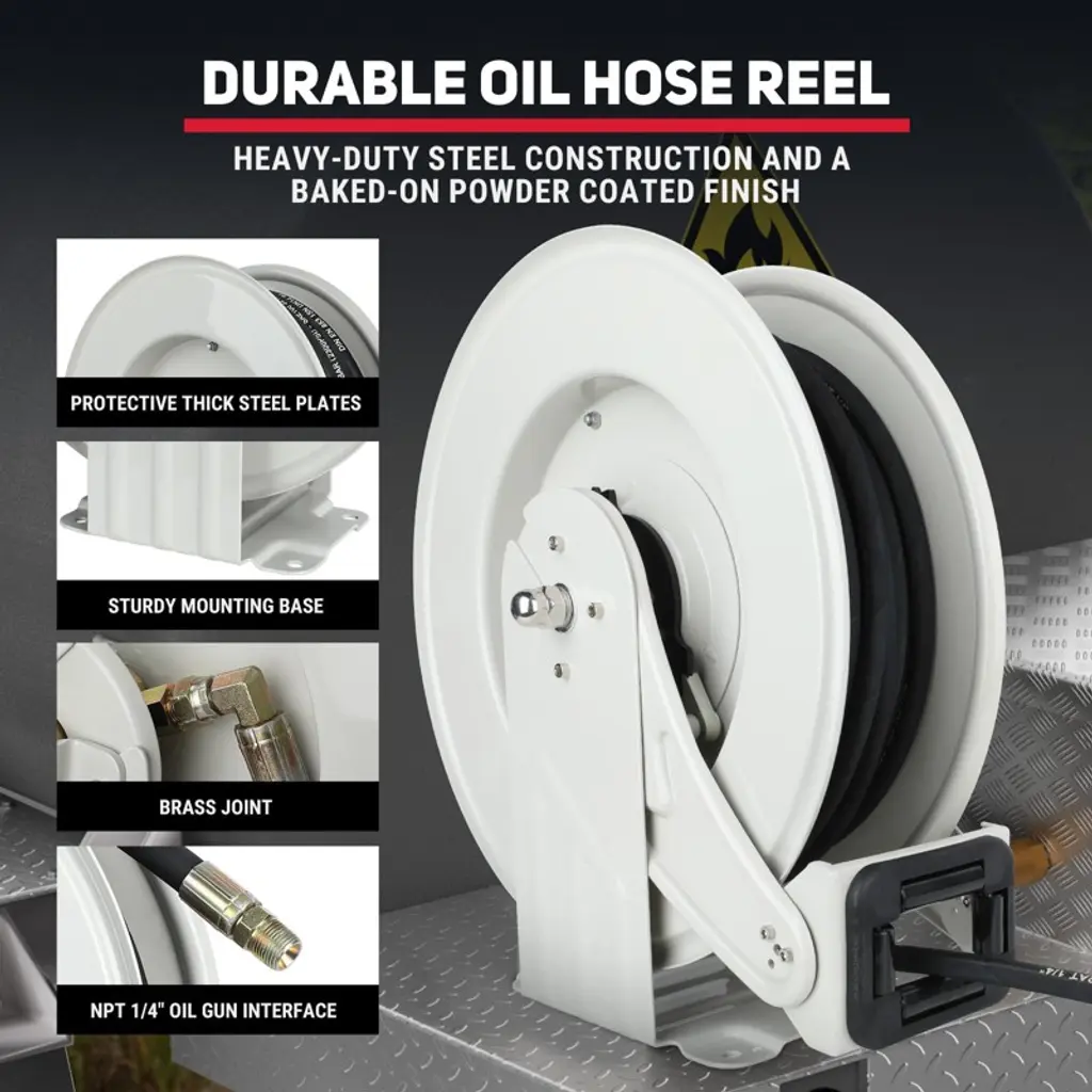 Mojgar Oil Hose Reel, 1/4 Inch X 50 Ft Retractable Fuel Hose Reel, Adjustable Support Arm And Pipe Gripper