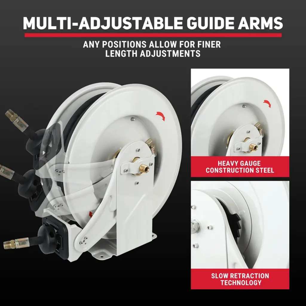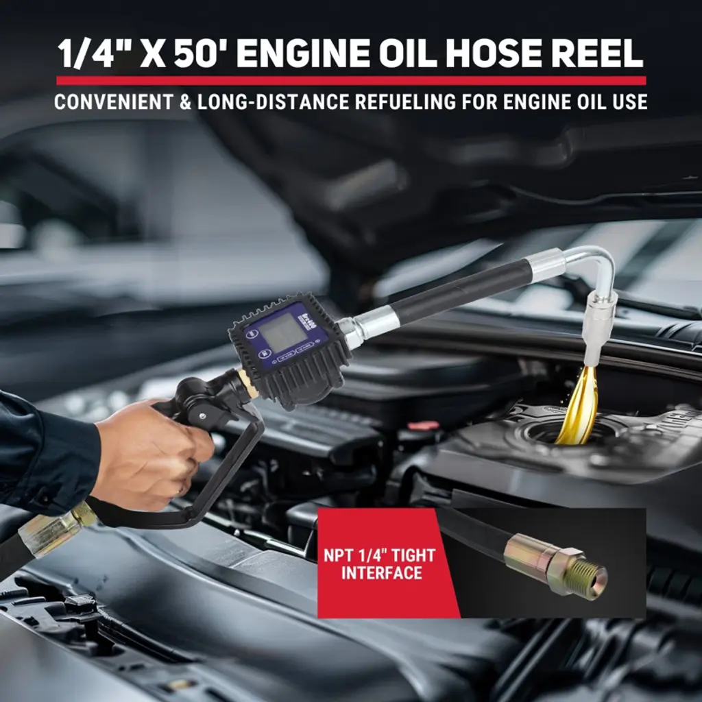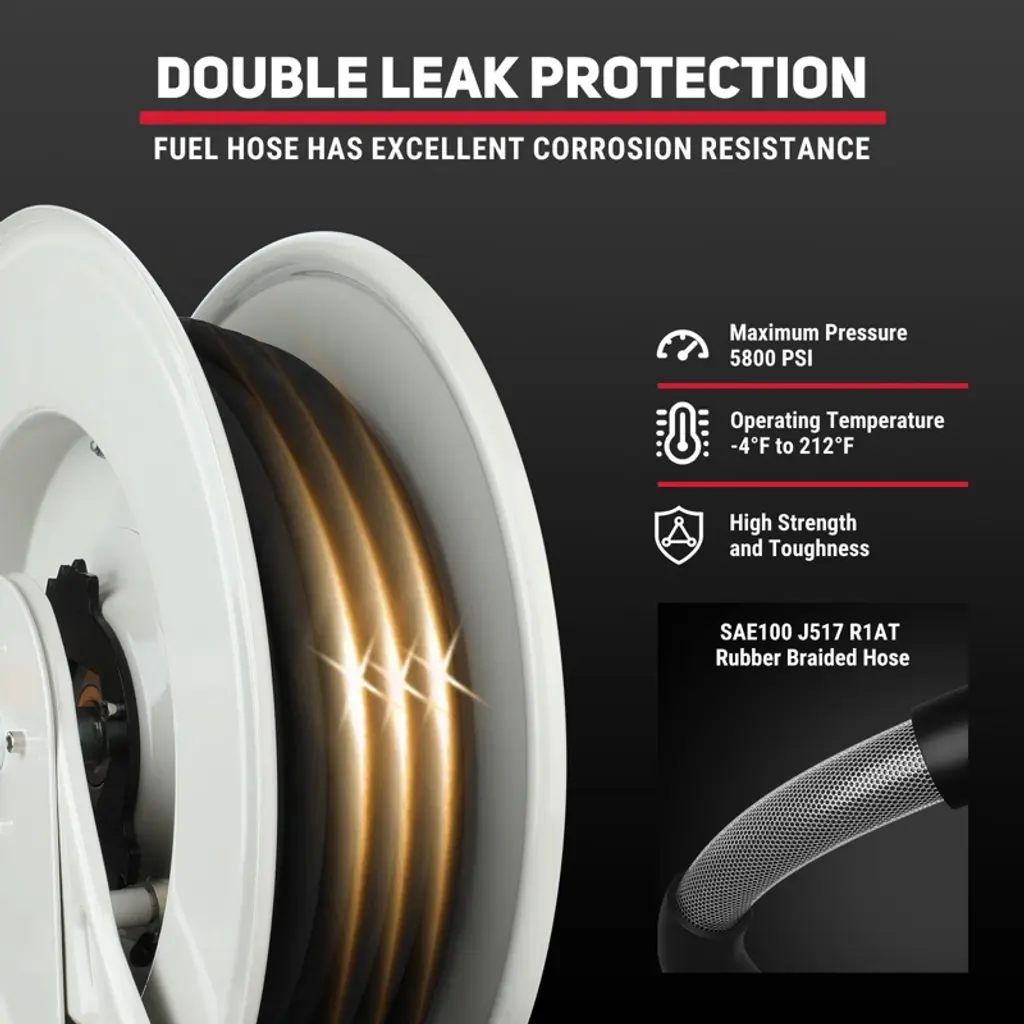 Heavy Duty Design Hose Reel: 1/4 in Retractable Hose Reel When pulling out the oil hose, and simply giving the hose a gentle tug after refueling, it will retract back counterclockwise under the work of the spring until stops with the adjustable hose stopperAuto Retraction System: Adjustable Hose Stopper and Non-Snag Rollers; through this Non-snag rollers aid in reduced abrasion & wear on the hose. Also, rated to a maximum pressure of 5800 PSI, capable of delivering fast flows & precision volumes, suitable for grease, hydraulic oil, butter oil, etcSolid Brass Swivel Joint: Oil hose reel utilizing double adjustment enclosed multi-position release ratchet spring, locking the hose at any desired length; 1/4" NPT fittings, oil compatible, high hardness, chemical resistance, durable, long life, ensuring smooth, uninterrupted fluid flow with no oil leaksAbrasion Resistant Industrial 50ft Hose: The oil hose reel is well-suited to all industries including Agriculture, Industrial, Mining, and Transportation, great for onsite refueling. Premium DIN EN 853 2SN DN6 WP 400 BAR(5800 PSI)-SAE100 J517 R2AT 1/4'' hose is resistant to oils, acids, puncture resistance, abrasion, weather and works in the toughest conditions of -104°F to 248°F (-40°C to 120°C)