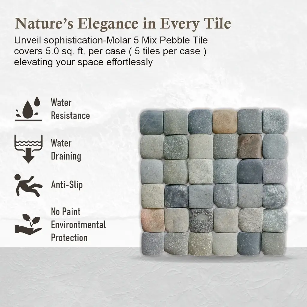 3D Pebble Tile Mosaics are uniquely honed to recreate the timeless historic floorings used in Italy for centuries. The more traffic it receives, the more timeless it appears.[ Covers 5 sq. ft. | 5 tiles per case ]CLASSIC AND ELEGANT DESIGN: Enhance the overall aesthetic of your space with b.o.i. With our 3D mosaic tiles, You can get a sophisticated touch in your homes, from floors and walls to backsplashes and outdoor areas. The Pale is the perfect color palette for places where you desire a clean and calming atmosphere.VERSATILE EXCELLENCE ACROSS SPACES: Ascending to prominence, these tiles emerge as the preferred choice across diverse environments. From shower floors, whose water-resistant qualities provide functional allure, to decking areas offering durability and visual allure and extending seamlessly to pool boundaries, they epitomize adaptability in design.SEAMLESS INTERLOCKING: The flat and polished finish of the pebble mosaic tiles makes them blend seamlessly into your design. b.o.i.tiles also create a smooth and continuous surface, enhancing the overall aesthetic of your space. Their consistent 12" x 12" size makes them easy to install, allowing you to effortlessly achieve a polished and professional look.ELEGANT BOUNDARIES AROUND POOLS: Redefine the aesthetic of pool areas with the mosaic's inherent elegance. Whether used to delineate POOL BOUNDARIES or enhance the surrounding landscape, their water-resistant properties and captivating design contribute to an inviting and cohesive atmosphere for leisure and relaxation.LONG LASTING AND DURABLE: Made with durability in mind, b.o.i pebble mosaic tiles are built to withstand high-traffic areas. Our mosaic tiles ensure longevity without sacrificing style in homes or commercial spaces. They are installed using a cement-based adhesive, which provides a solid and lasting bond, securing them firmly in place despite daily use.