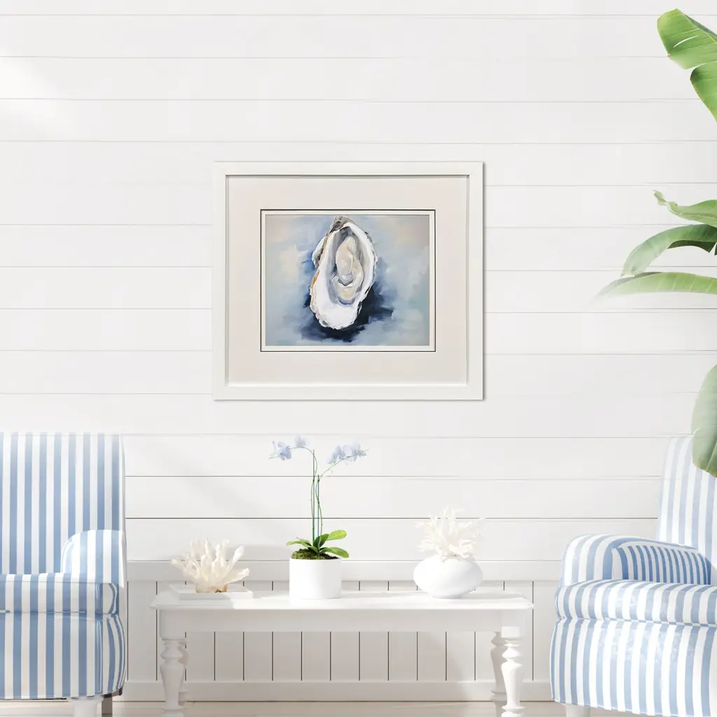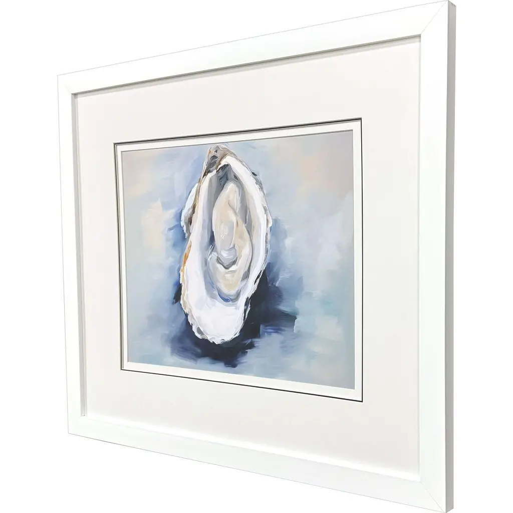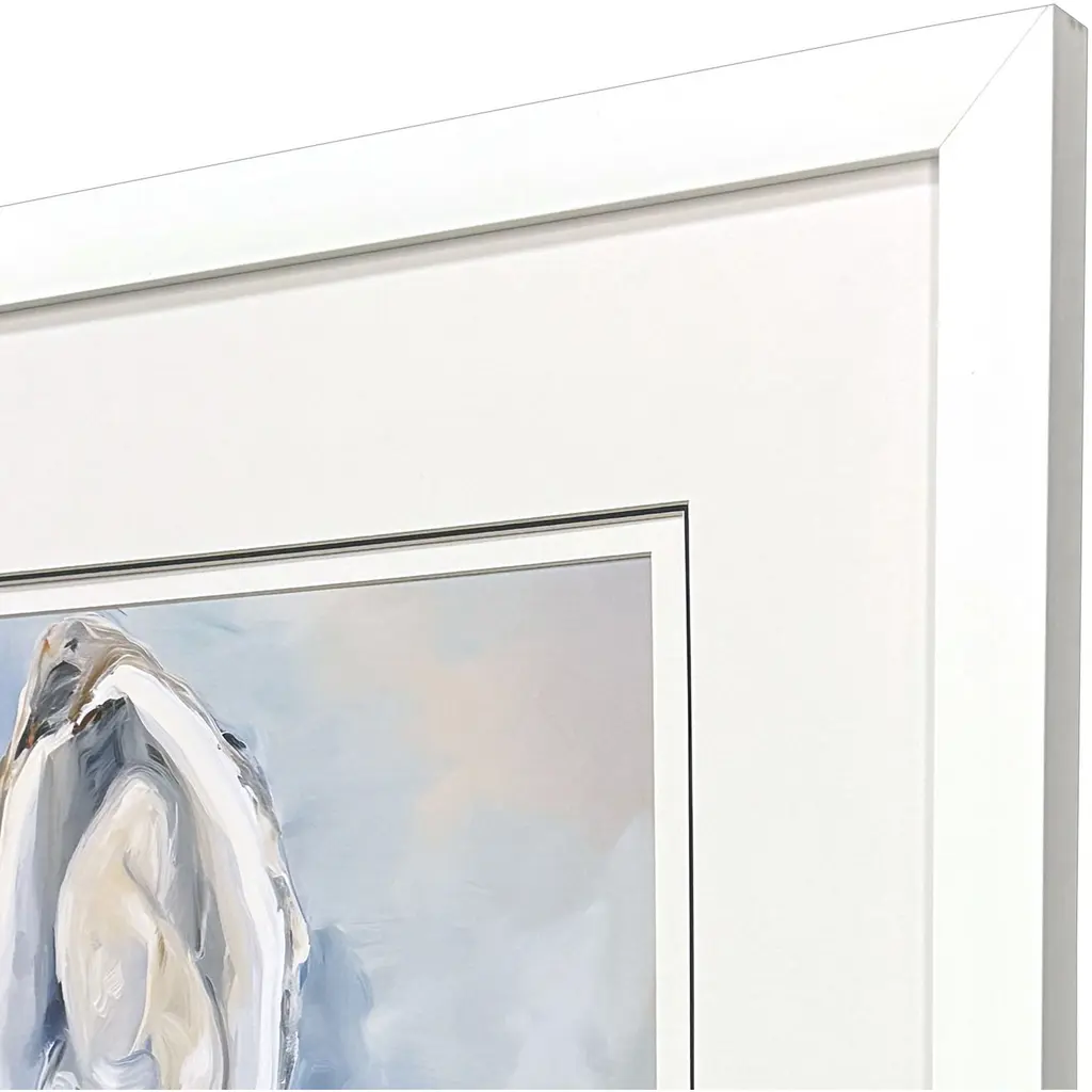 A mollusk shell print is triple matted in white, navy blue and white. Framed in a block profile moulding in a matte white finish.