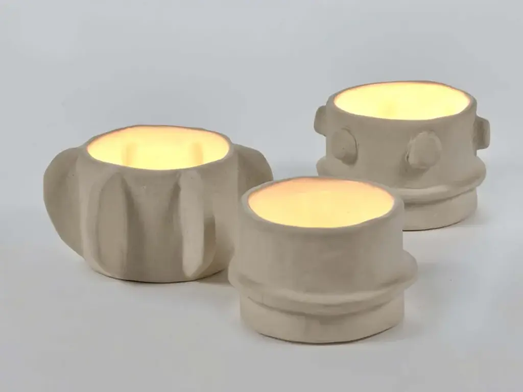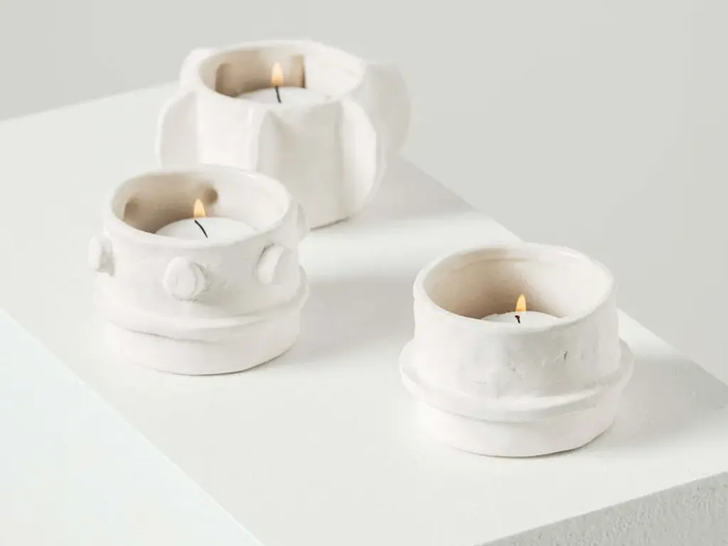 Molly ass/3 is a set of 3 tealight holders made of stoenware.Please be aware that the price for each item is listed individually. A minimum order quantity of 3 pieces has been set to ensure you receive the complete assortment of three different shapes in the end. These white tea light holders are made of stone and have a matte finish on the outside, while they are glazed on the inside. The design and detailed details characterise the style of designer Marie Michielssen.Eclectic, a world full of wonderful extremes based on a well-thought-out structure. That is the first thing that comes to mind for the accessories collection of Marie Michielssen. Serax ’s resident designer likes variety, both in style and in her use of materials and colours. From papier-mâché through concrete to porcelain, cheerfully coloured or in muted natural colours, inspired by constructivism or by the earth in its most rudimentary form, each collection is completely different.