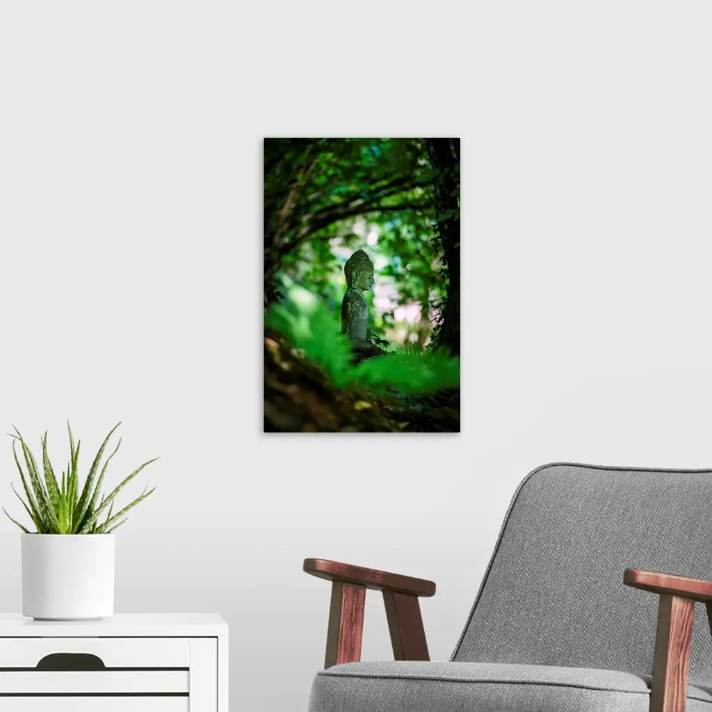 A stone statue of a serene monk is depicted in a meditative posture, bathed in natural light and shadow. The background features a tree trunk and foliage, enhancing the tranquil atmosphere.