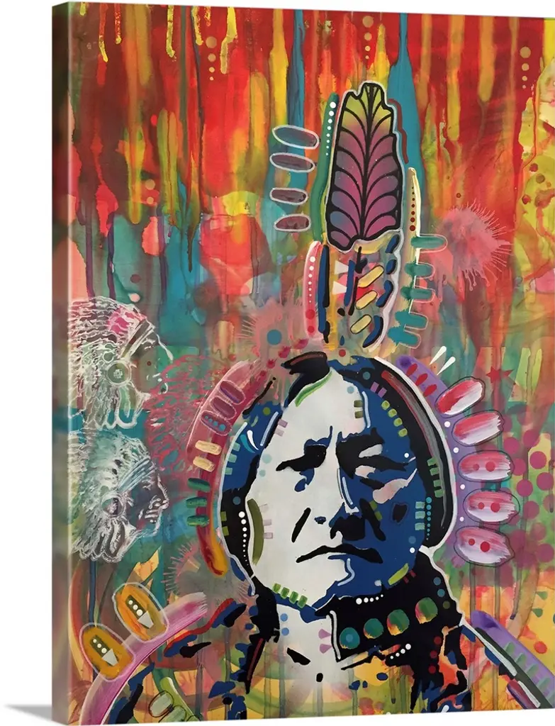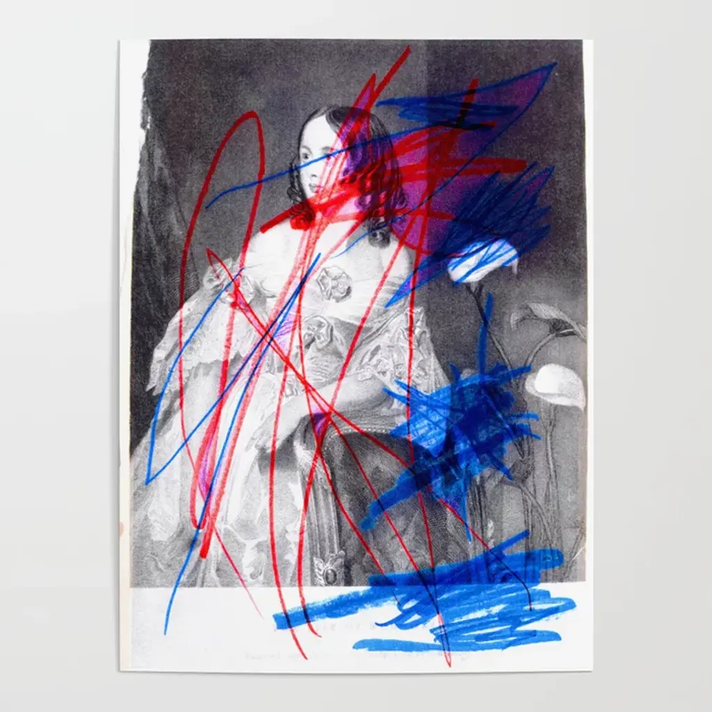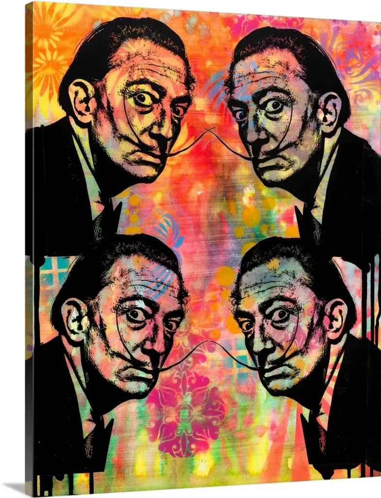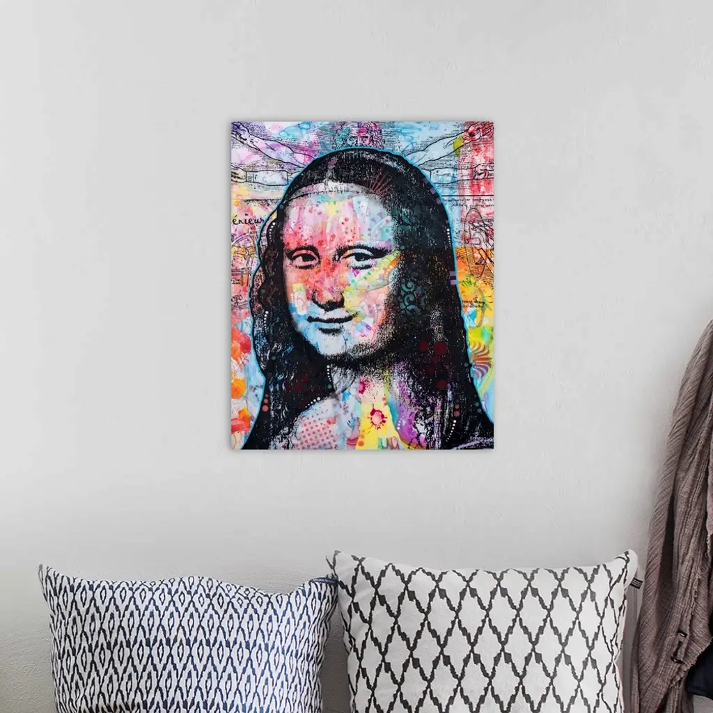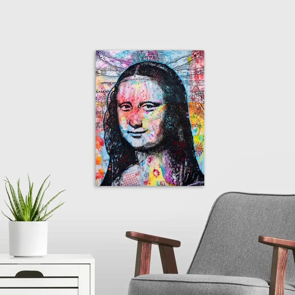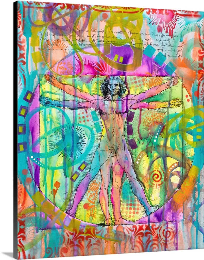 Illustration of the Mona Lisa with da Vinci's Vitruvian Man on the colorful background.
