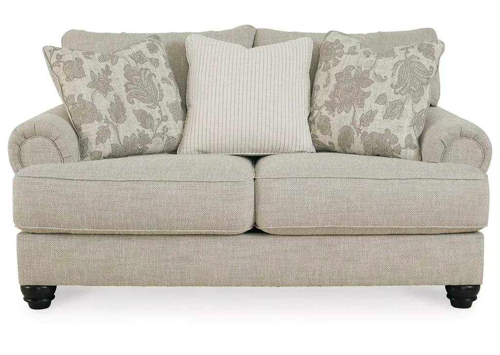 This loveseat strikes a beautiful balance between classic and current. Traditional elements include t-cushion seating and setback roll arms, angled for modern flair. Posh collection of pillows in spa mist and jacquard paisley make a muted, mellow complement to the loveseat’s casual textured chenille upholstery. Choice of sandstone beige is a light and lovely style awakening.