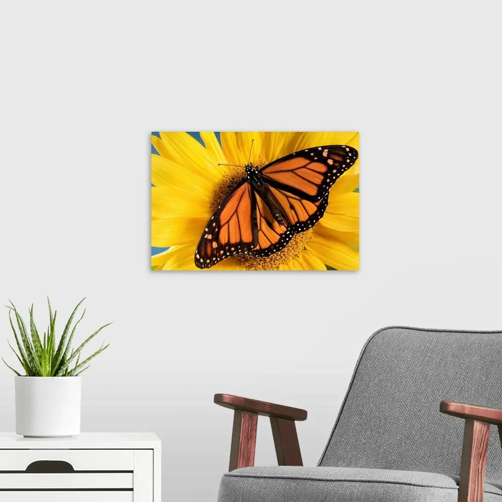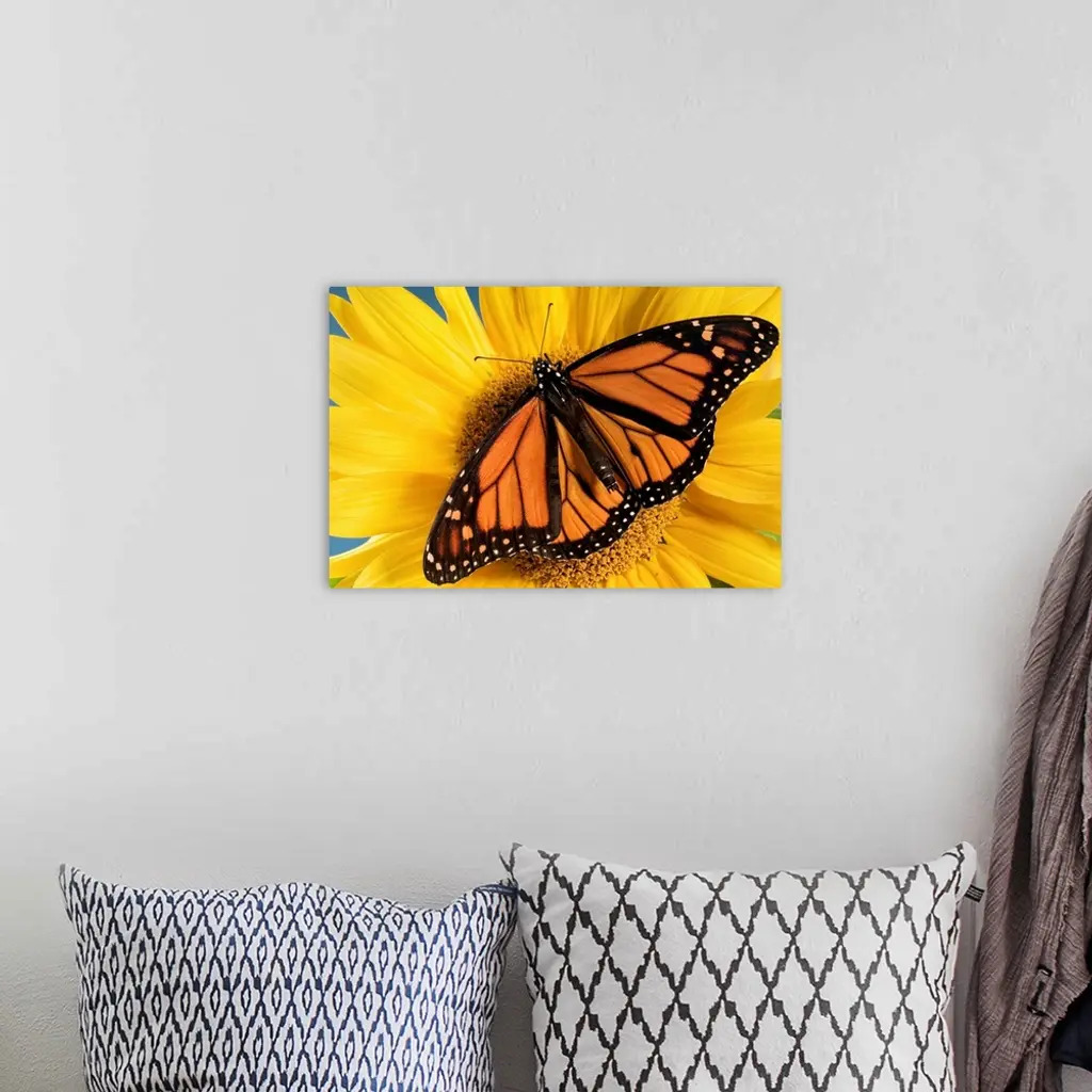 Monarch Butterfly On Sunflower wall art for home and office decor. Discover canvas art prints, photos, mural, big canvas art and framed wall art in GreatBigCanvas.com's varied collections.