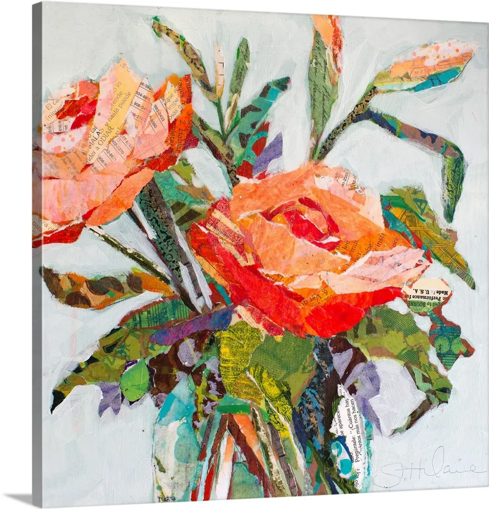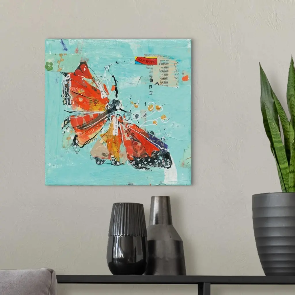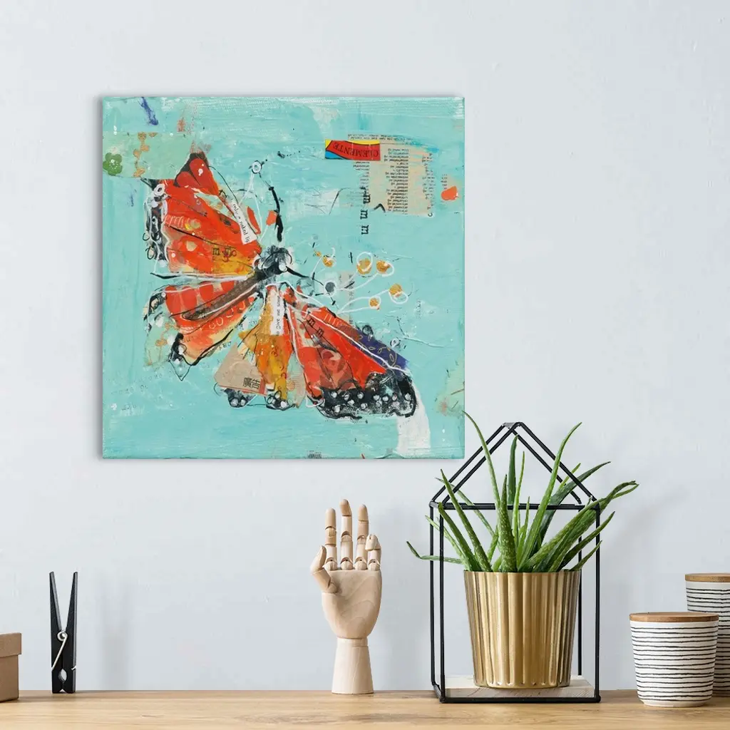Orange and red abstract monarch butterfly on a teal background made with mixed media.