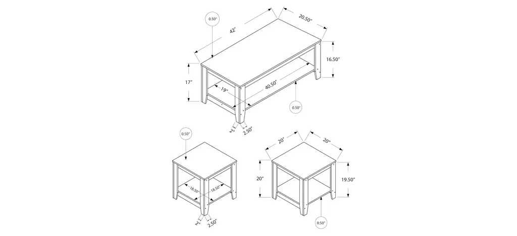 Whether you need the perfect living room table set to match your current decor style or if you're starting fresh, the Monarch Specialties 3-pc. Table Set is perfect for you. In a beautiful trendy wood-look finish, these living room tables offer top and bottom shelves for ample storage space so that you can sport any decorations or electronics. Made of a sturdy thick panel construction, these tables can be placed just about anywhere in your living room, family room or basement. They are also perfect for small homes, condos or apartments.