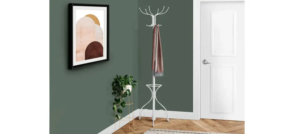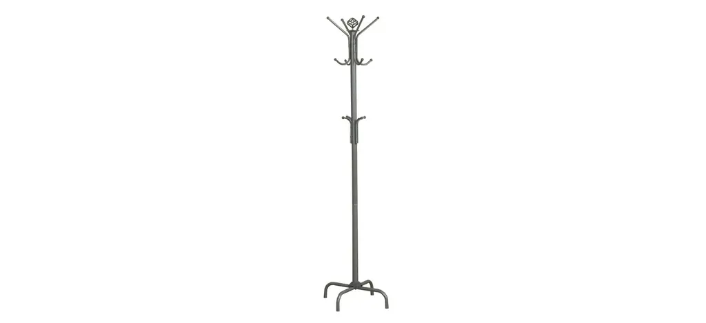 Both convenient and essential in your entrance, living room, family room or bedroom, the Monarch Specialties Coat Rack is your ideal accessory to minimize clutter and take up less space in your small home, apartment, condo or dorm. Easy to use, it features 12 hooks and a wide base to catch and evenly distribute the weight of your jackets, hats, scarves and other apparel. In a metal finish, this coat tree is a functional item you must have for useful storage. Keep all those accessories together in an organized way.