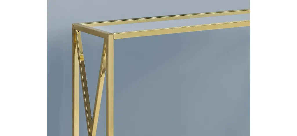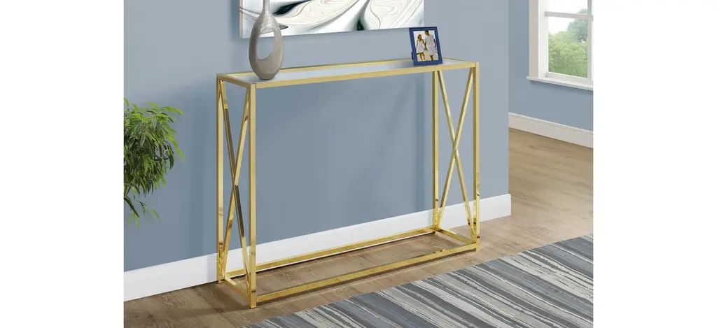 The sophisticated minimalist style of the Monarch Specialties Slim Accent Table will be the most multi-functional furniture piece you own. The thick clear tempered glass table top provides enough space to set a lamp, pictures, books or decorative objects. This chic table is framed with a sturdy high polish chrome metal base with an X design on the sides for a touch of glamour. Compact and clean lined for small spaces, the height makes it ideal to set out drinks and hors d'oeuvres when entertaining. Whether you use this in an entryway, hallway, office space, or behind your sofa this versatile accent console table provides multiple uses. Assembly is required.