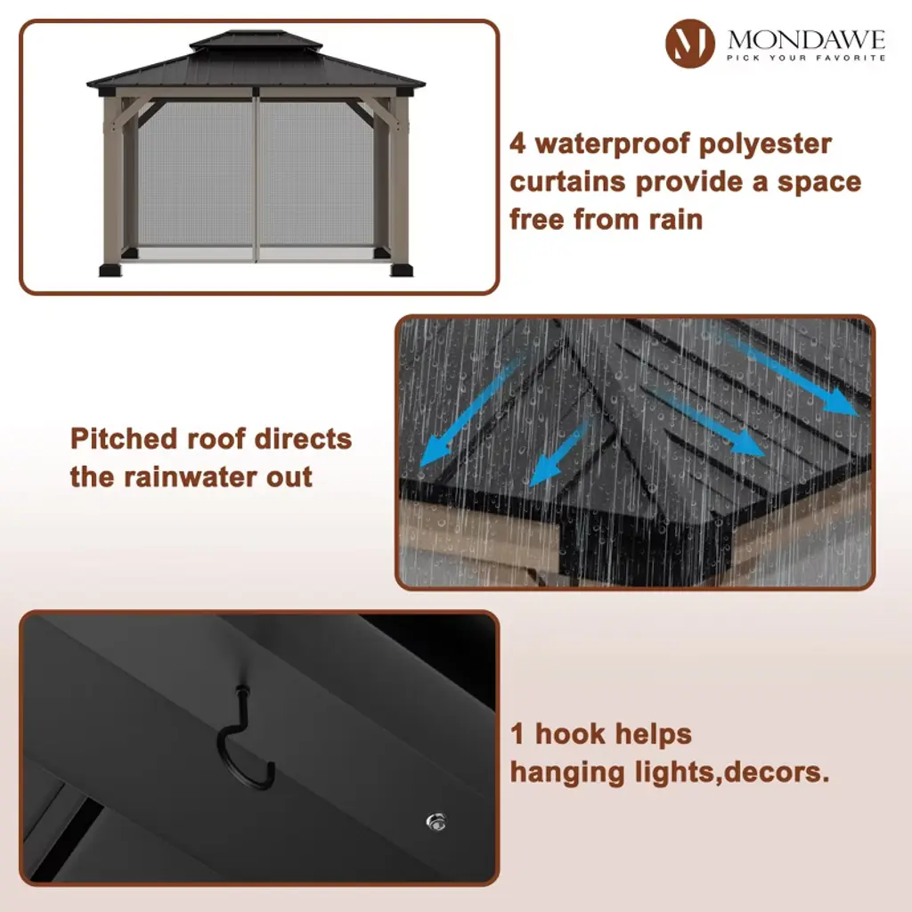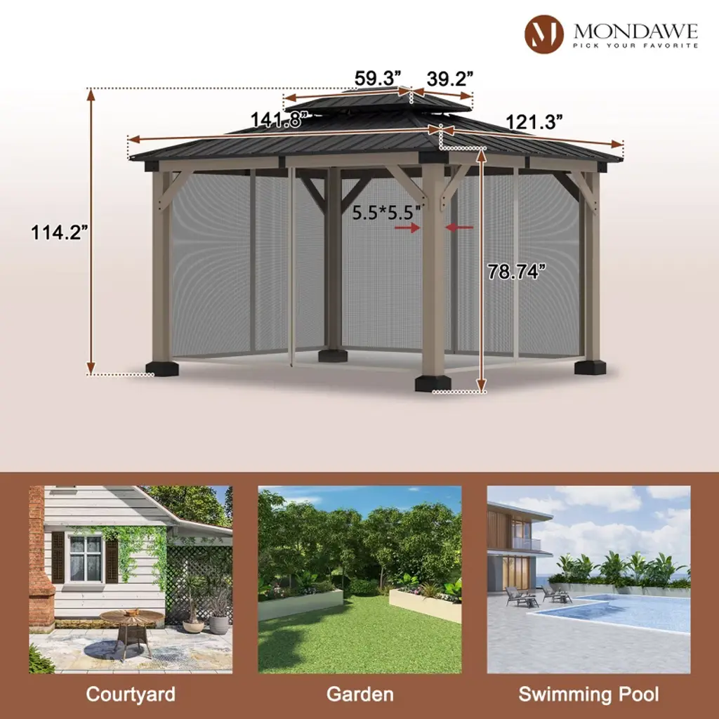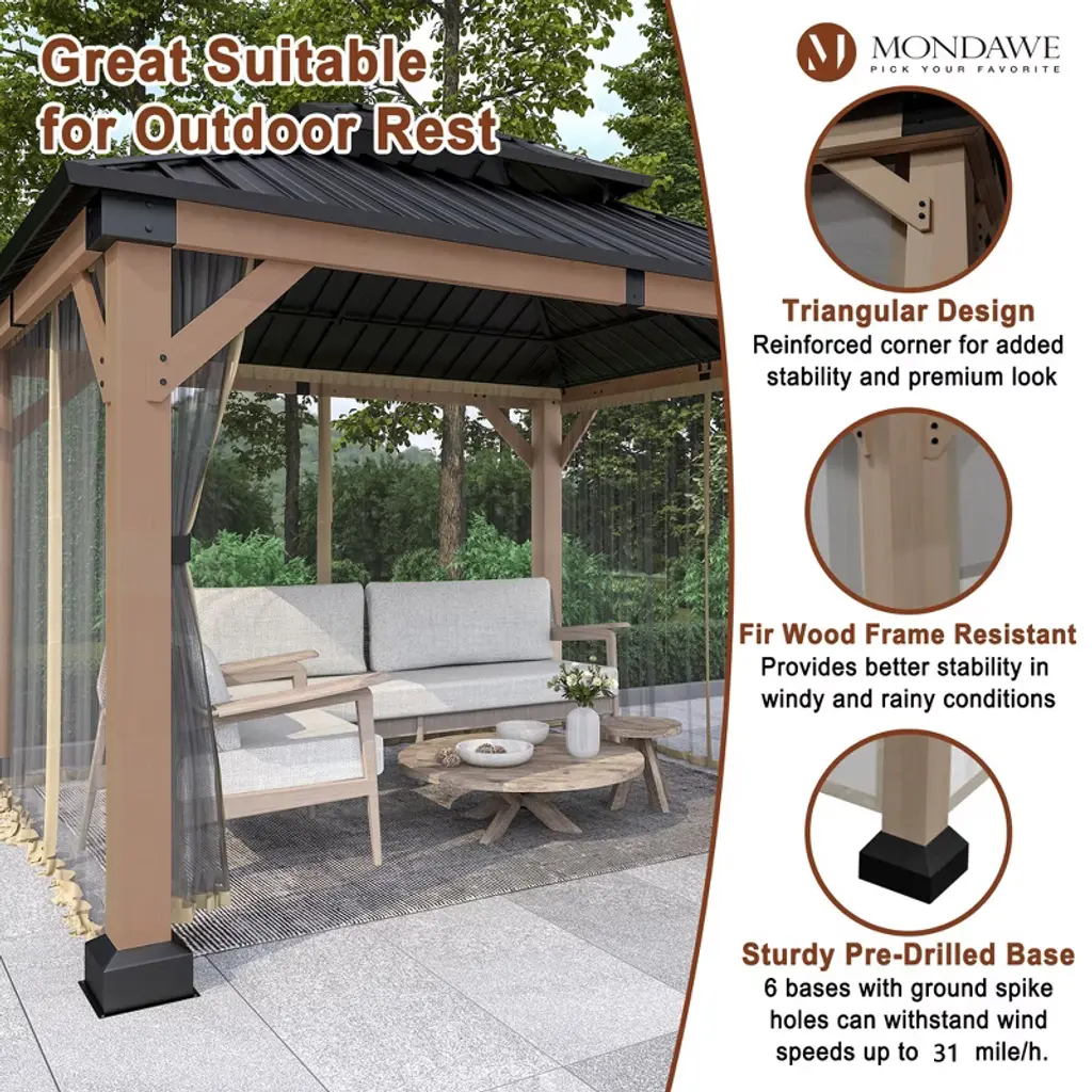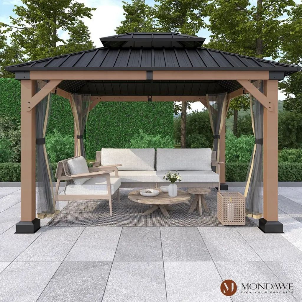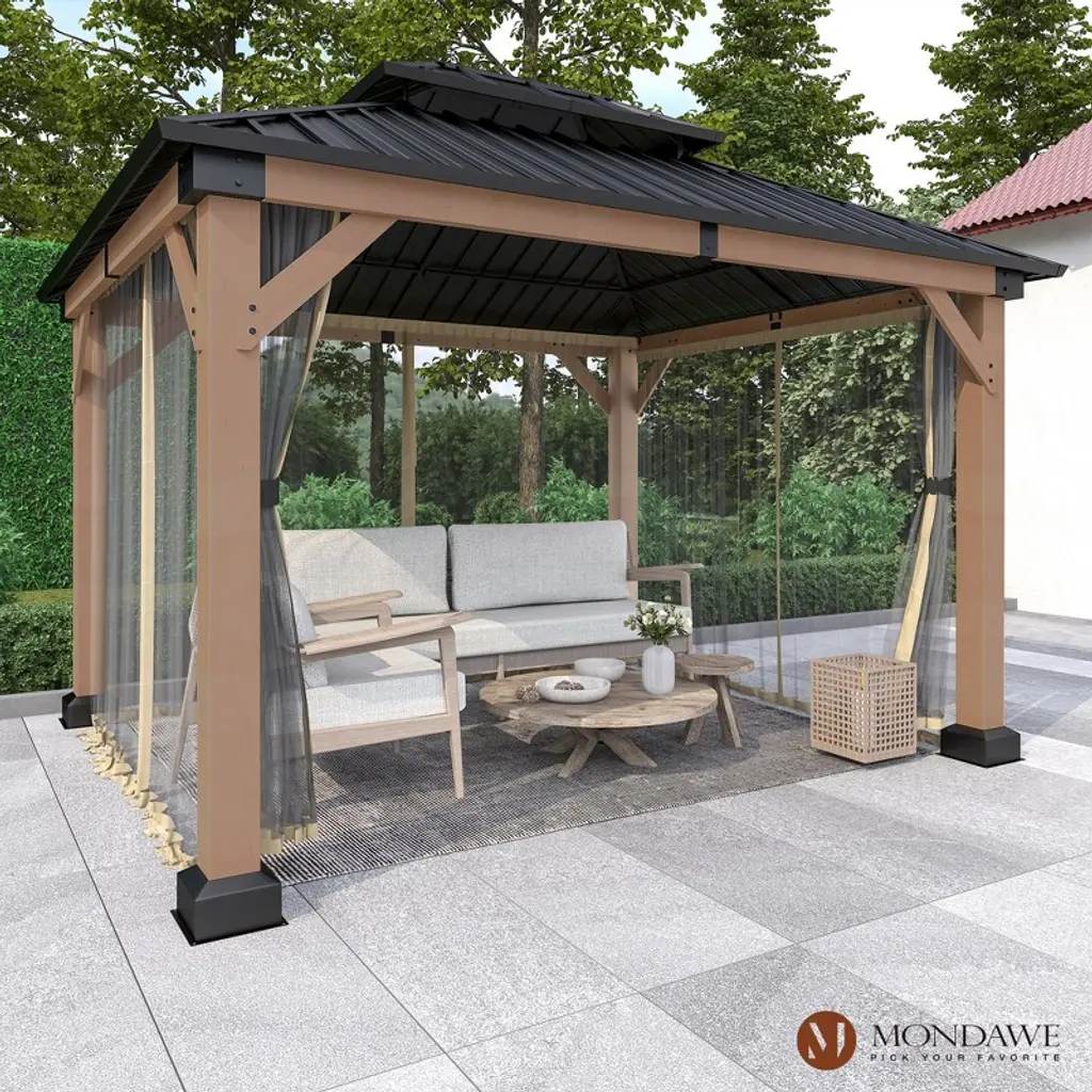 Mondawe 10x12ft. Outdoor Solid Wood Frame Patio Gazebo Galvanized Steel Hardtop With Netting