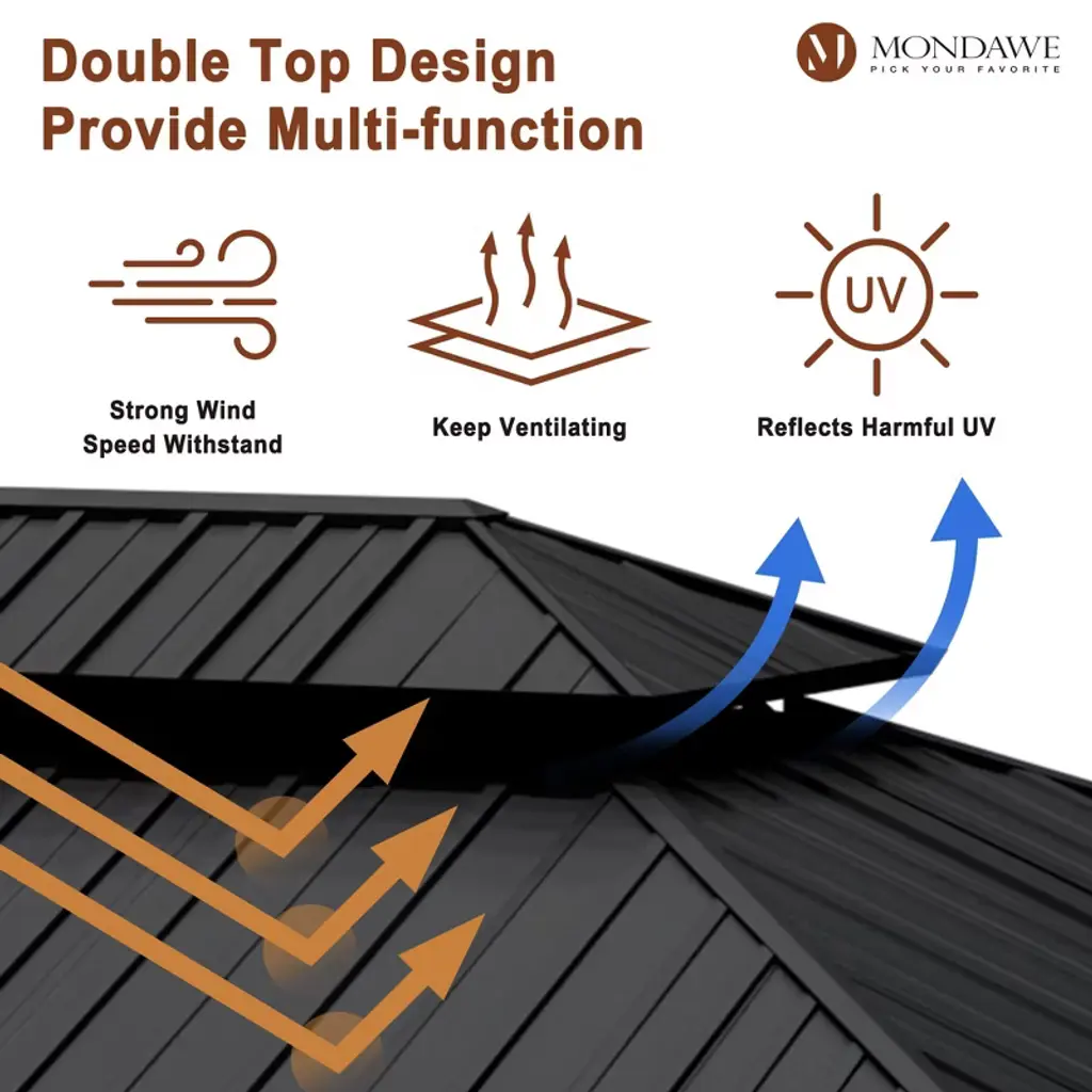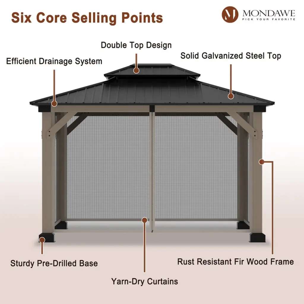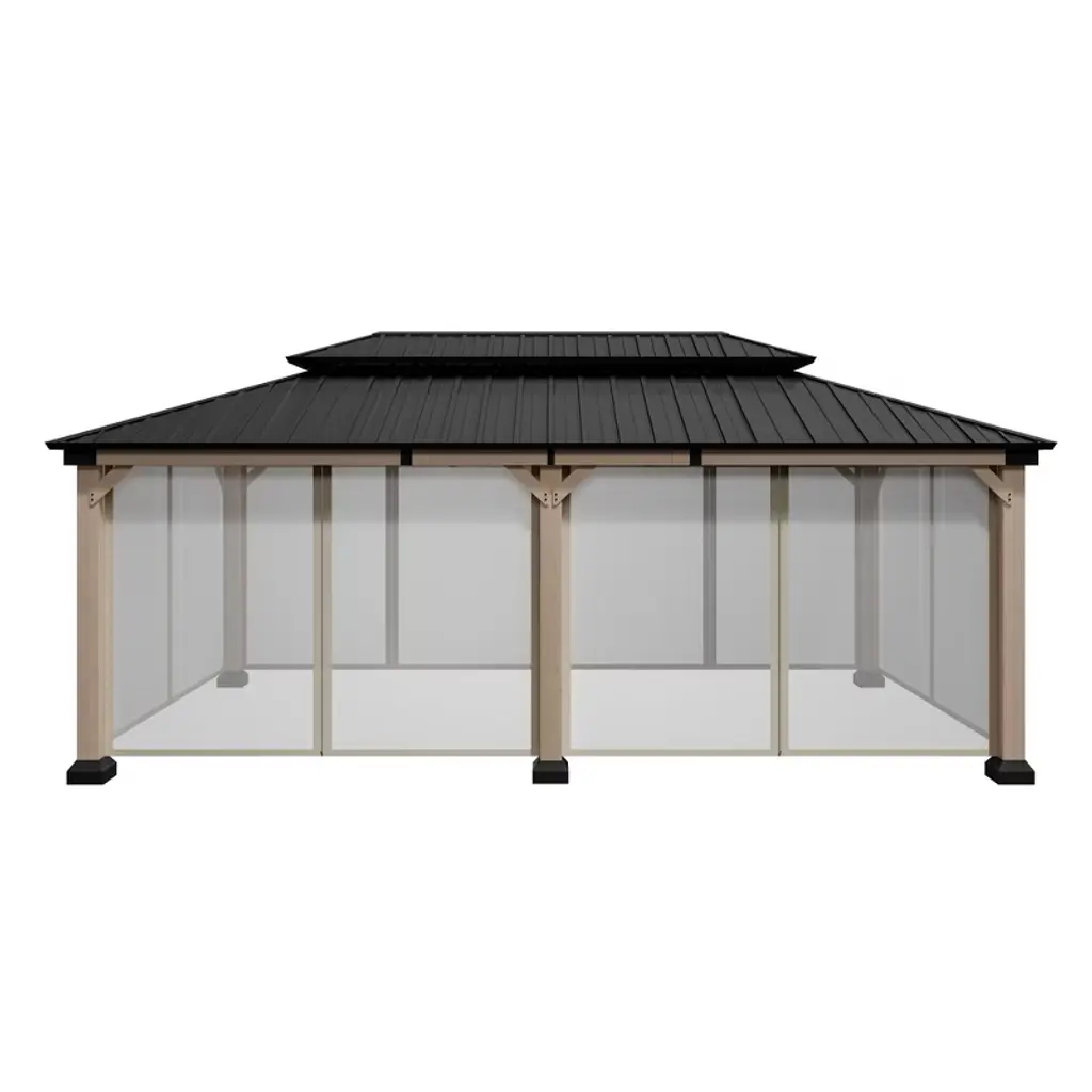 Upgrade your outdoor space with our 10x12 ft cedar solid wood frame pavilion, featuring a galvanized steel double-layer canopy for superior durability against harsh sunlight and heavy snow. The smart double-layer ventilation ensures a cool, comfortable environment-perfect for relaxing, gatherings, or alfresco dining. Built to last, designed for enjoyment.