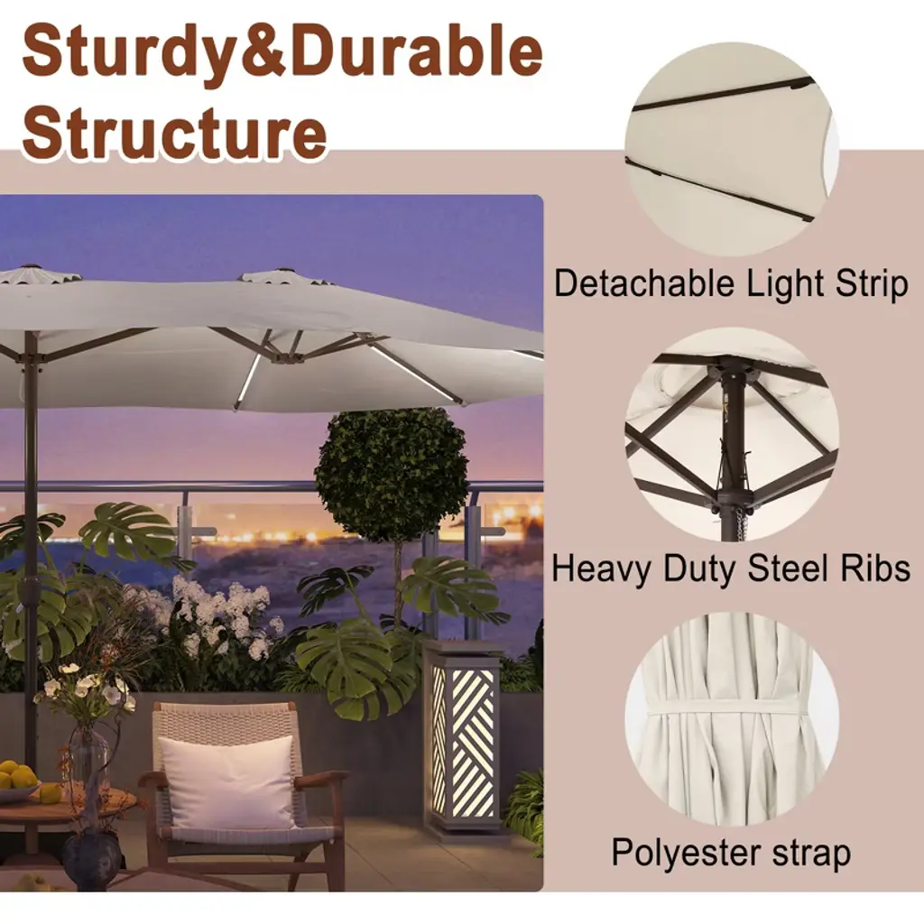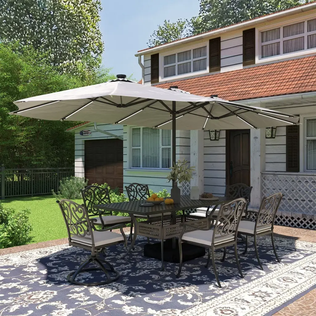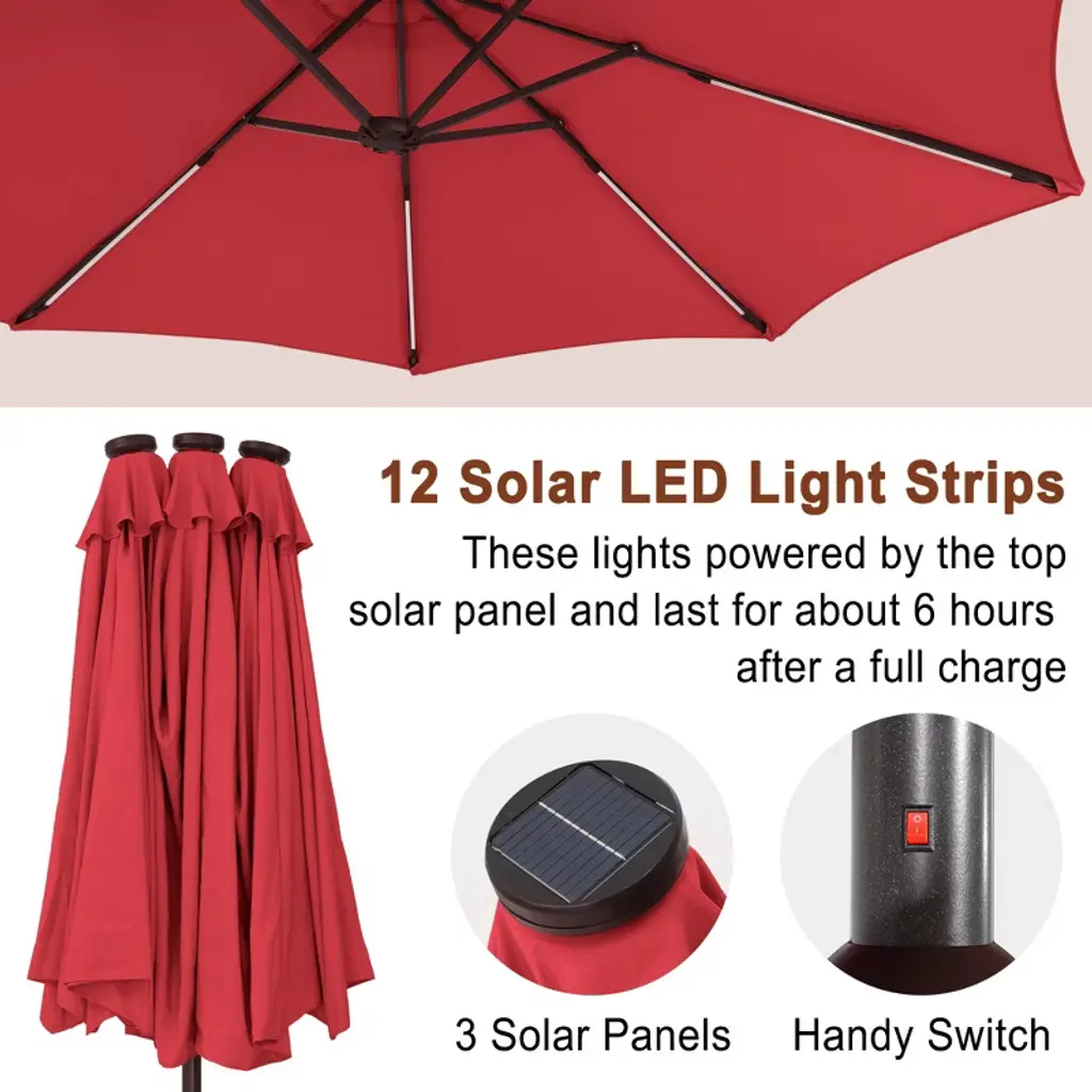 Mondawe 15ft Outdoor Patio Double-sided Umbrella with Crank and Base Included. Double-sided design, providing approximately 133 square feet of shade. Air-Vented Canopy Design, and can better stabilize the umbrella in the breeze. Rocker design, easy to open and close the umbrella. Polyester fabric through the American Standard Level 4 certification, lasting color, and waterproof and UV protection.