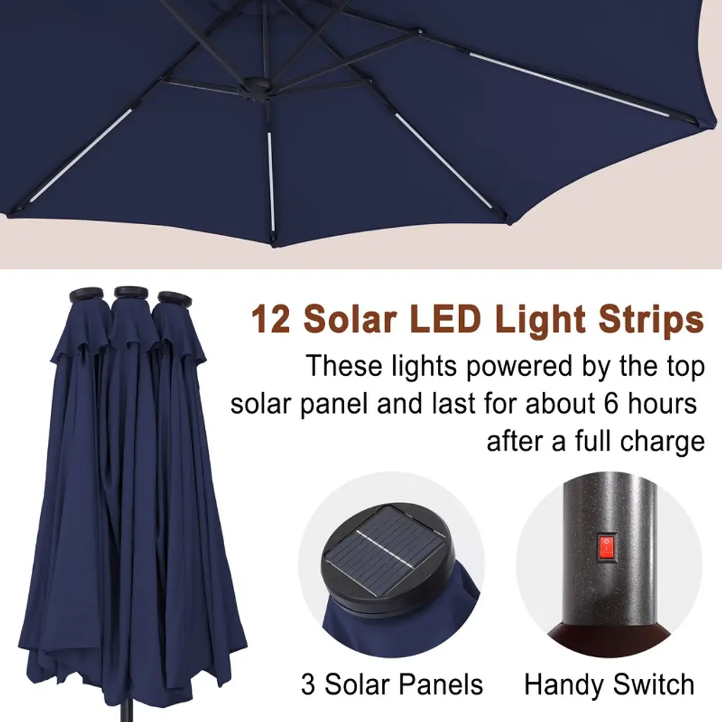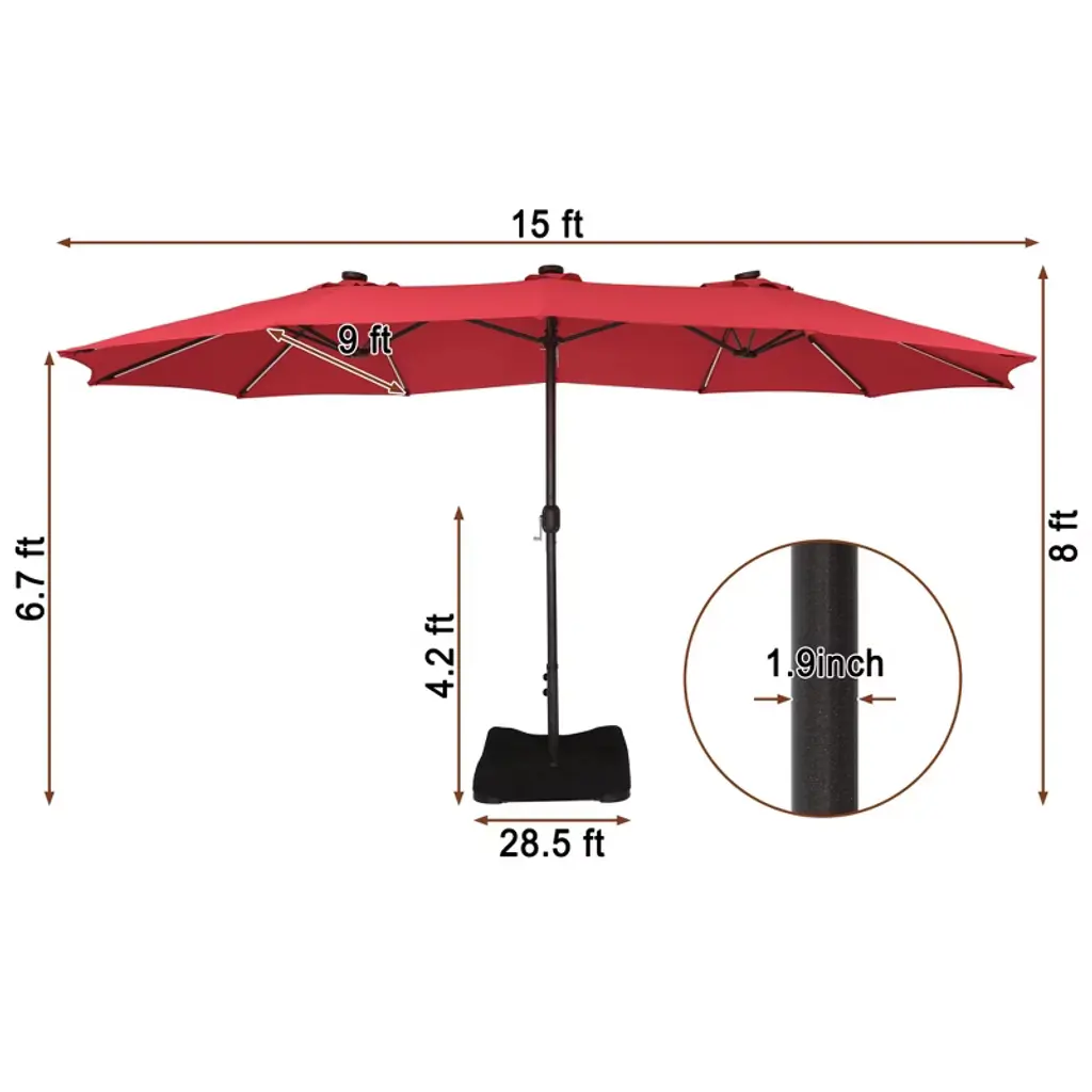 Mondawe 15ft Outdoor Patio Double-sided Umbrella with Crank and Base Included. Double-sided design, providing approximately 133 square feet of shade. Air-Vented Canopy Design, and can better stabilize the umbrella in the breeze. Rocker design, easy to open and close the umbrella. Polyester fabric through the American Standard Level 4 certification, lasting color, and waterproof and UV protection.
