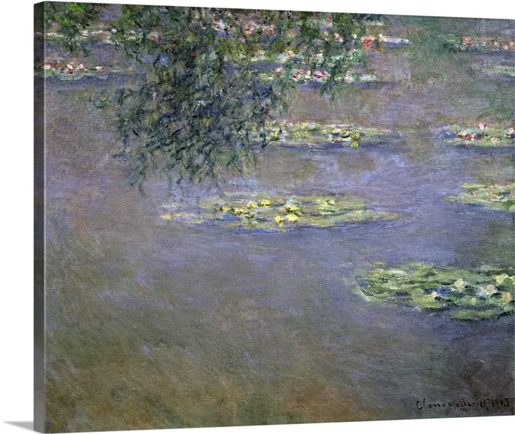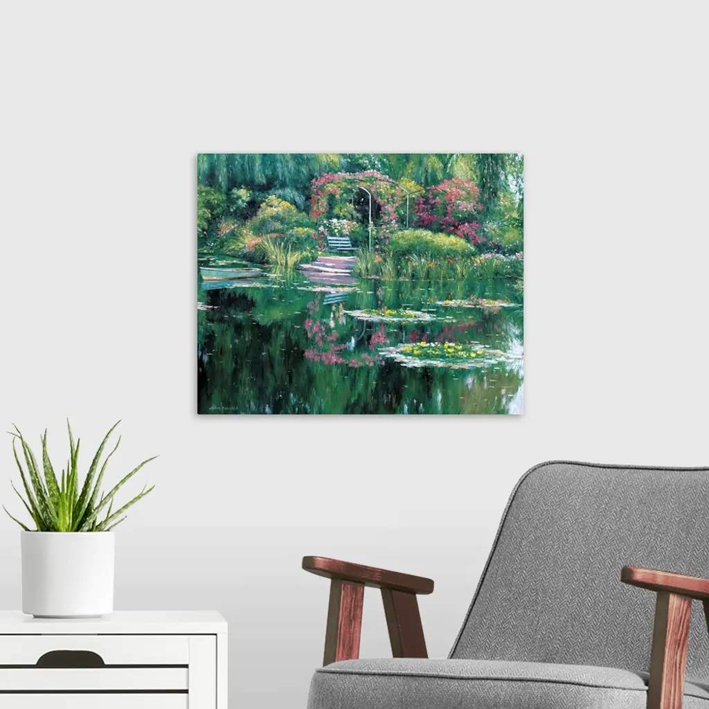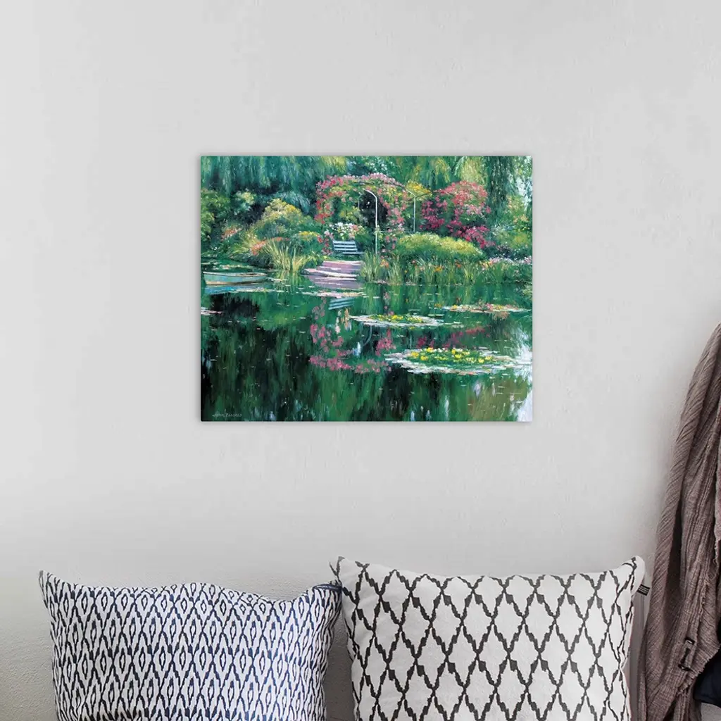 A pond with two islands covered in flowers with a trellis and a bench on the stone walkway.