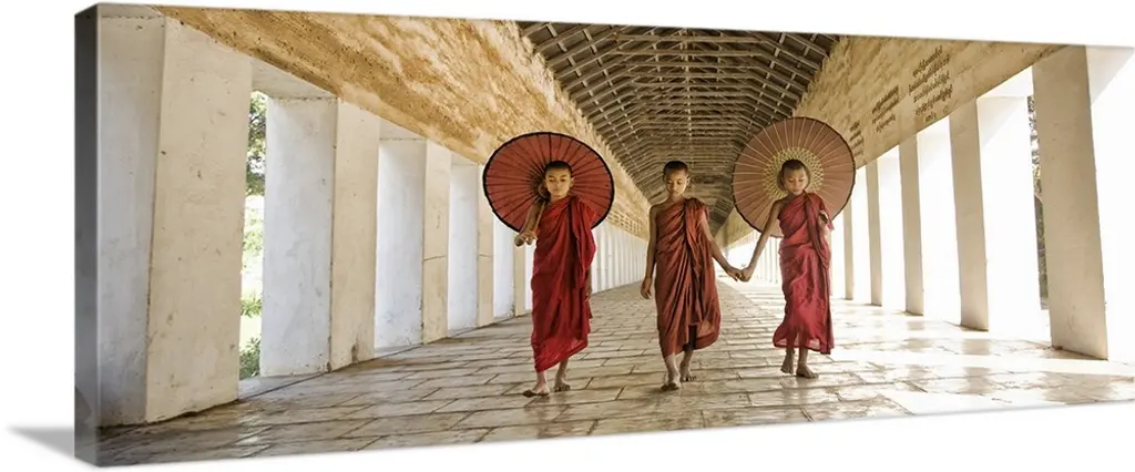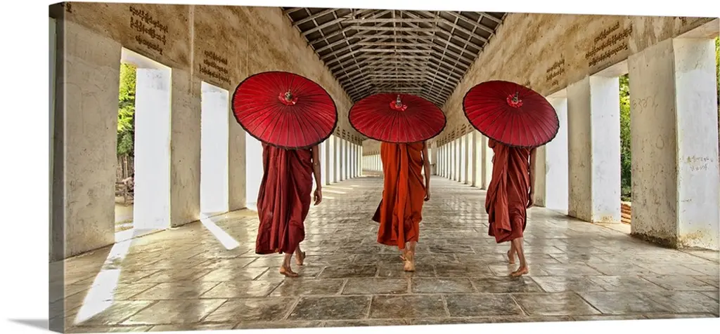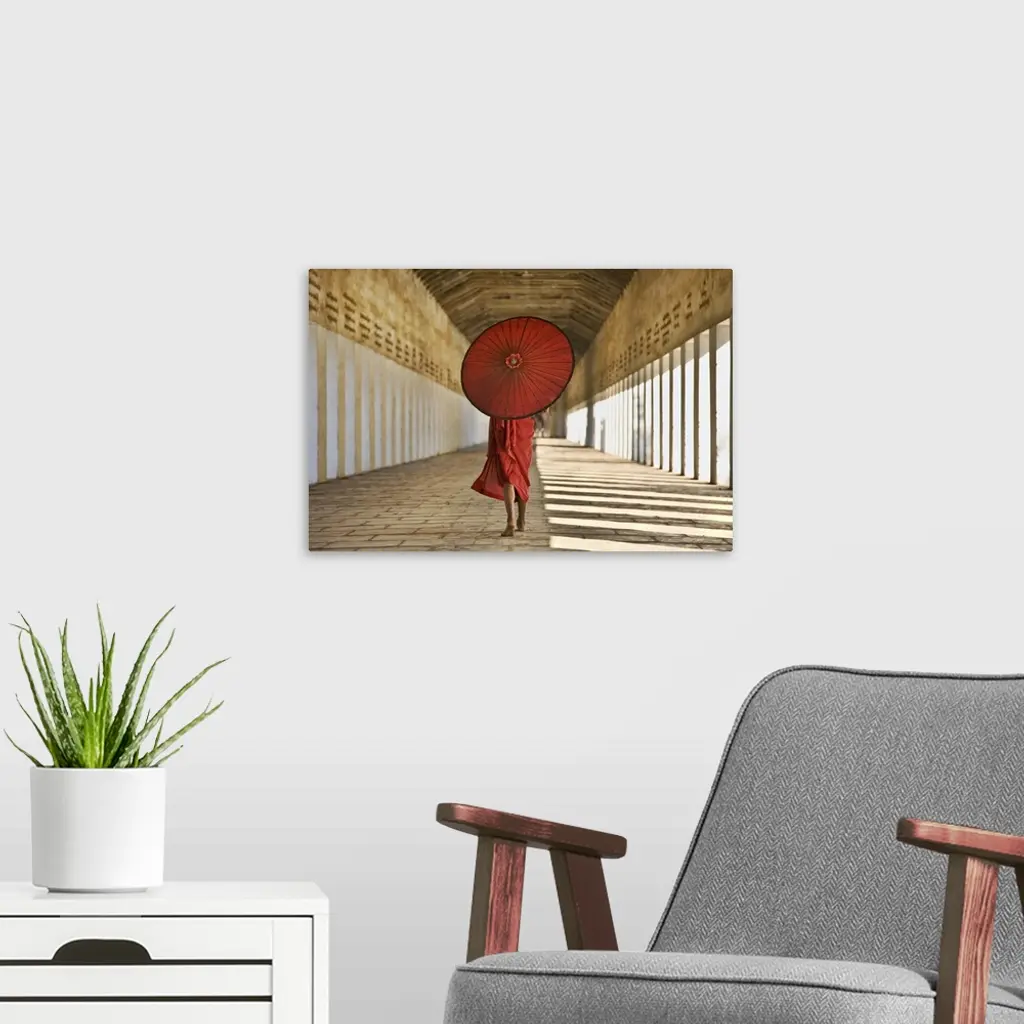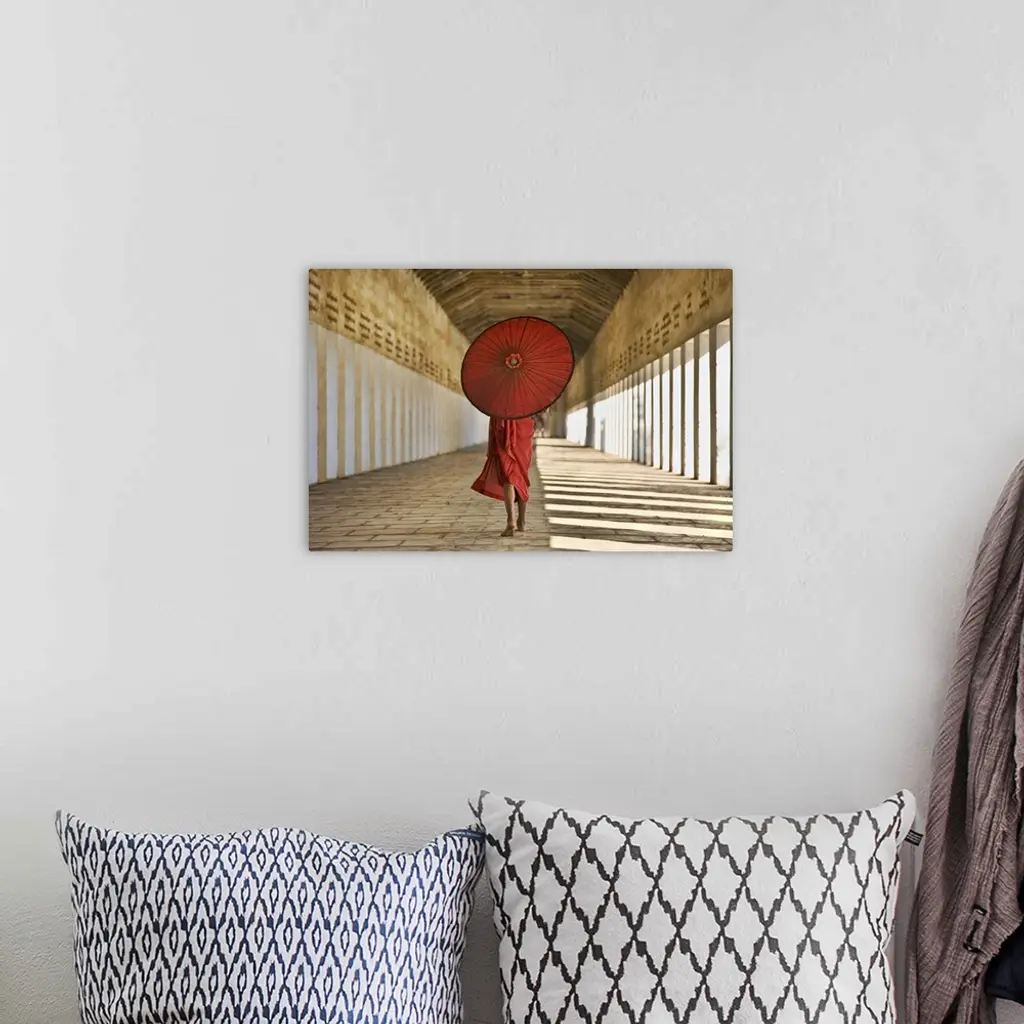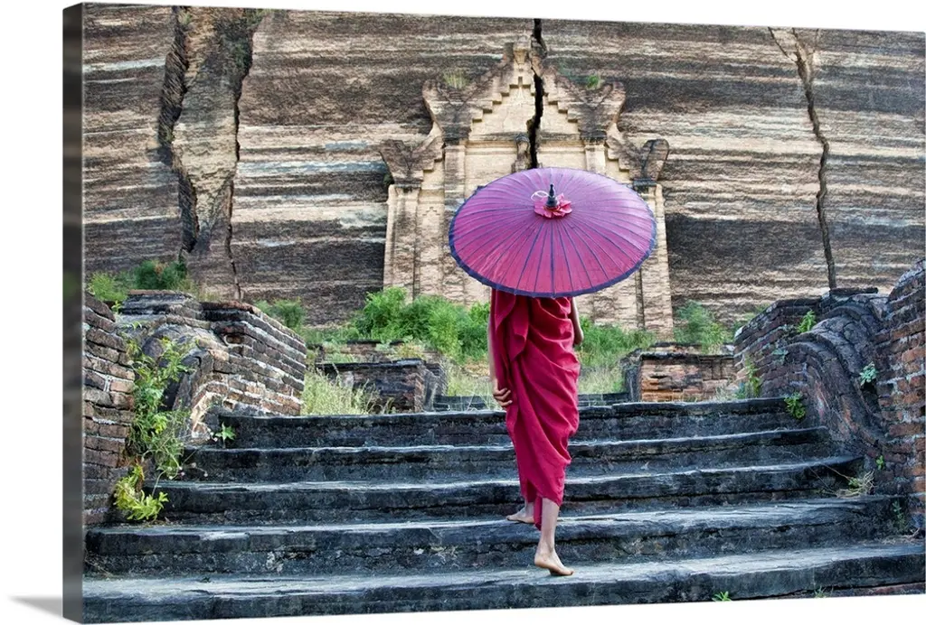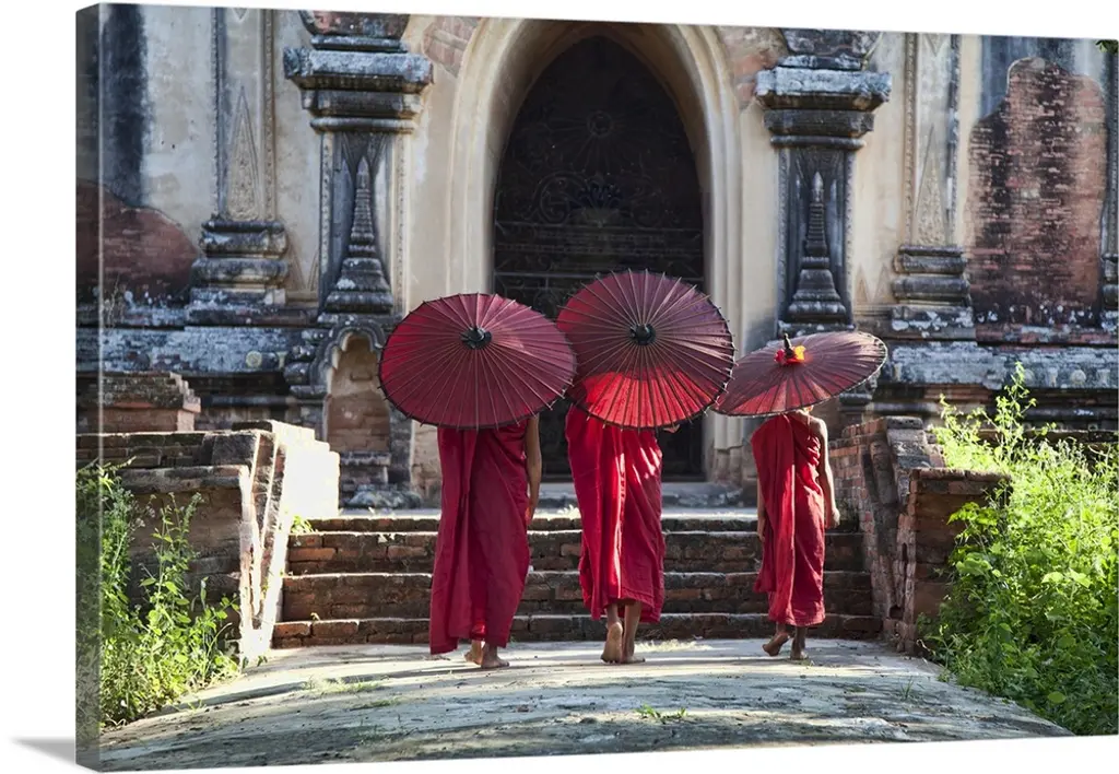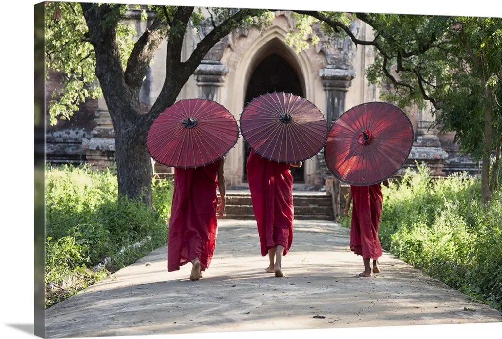 Monk With Parasol Walking In Monastery, Bagan, Burma