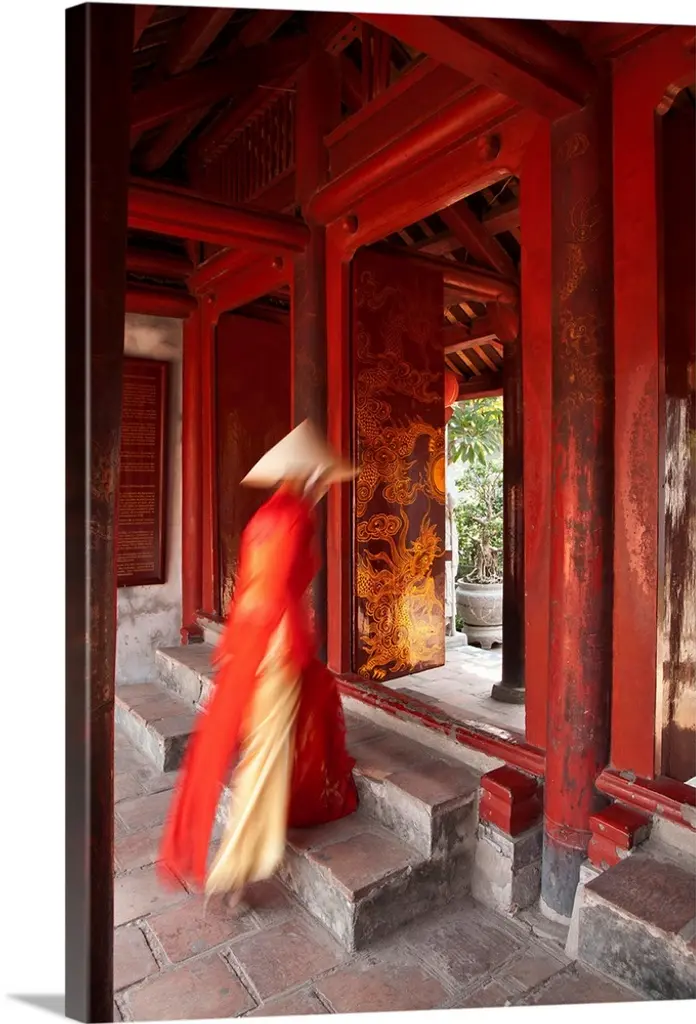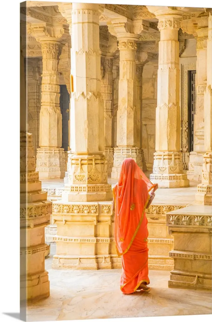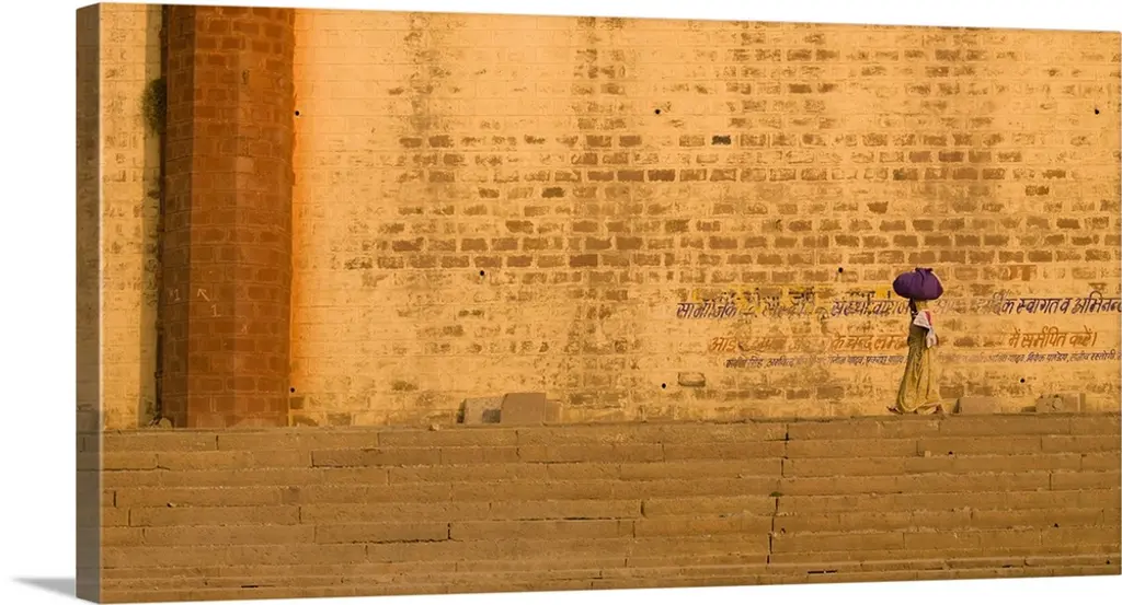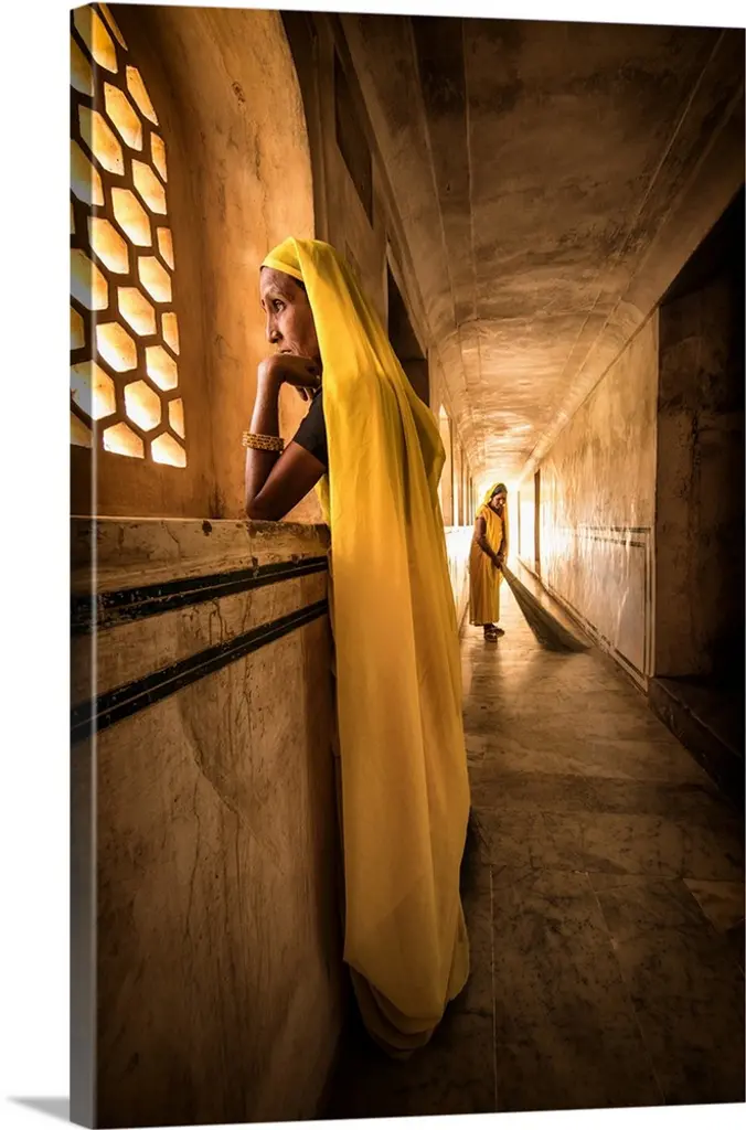Horizontal photograph of a Monk covered from the shoulders up by an umbrella, walking down the stone hallway of a monastery in Bagan, Burma.