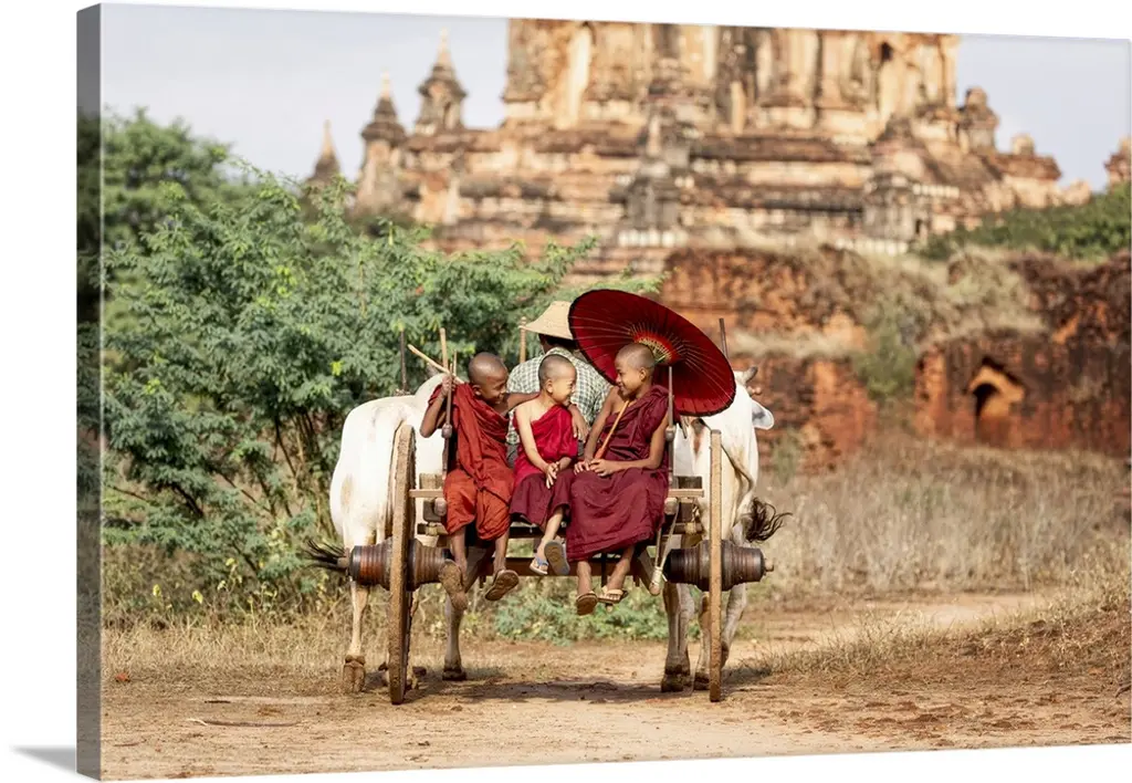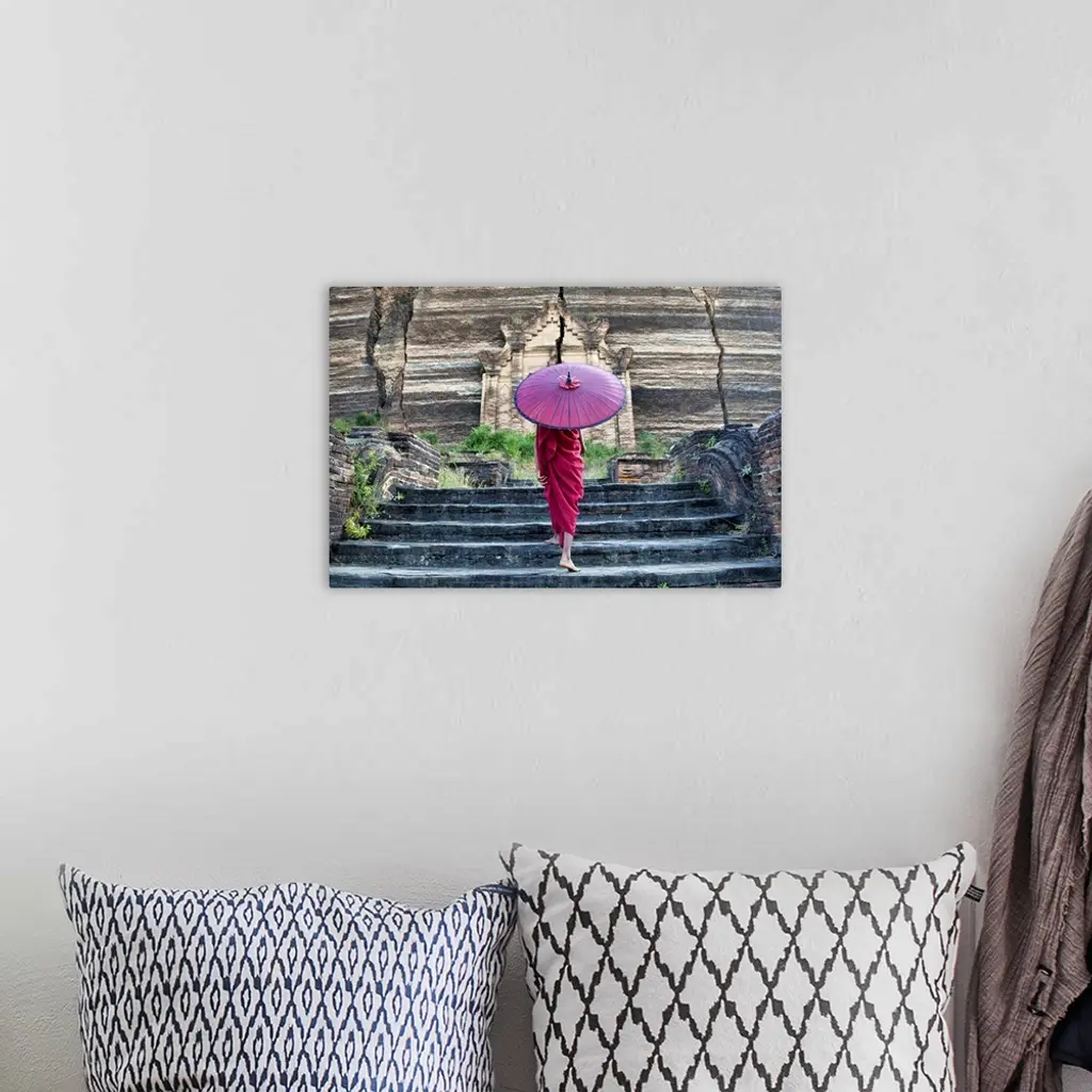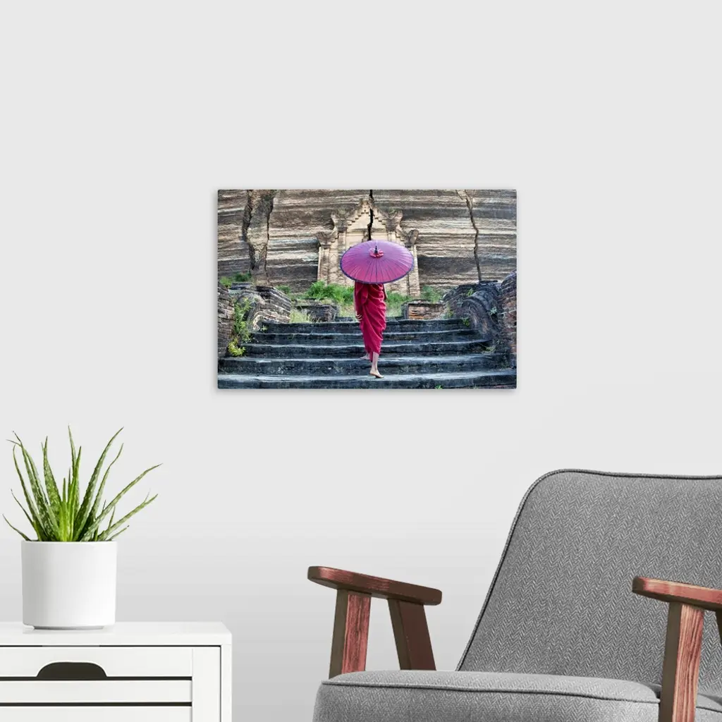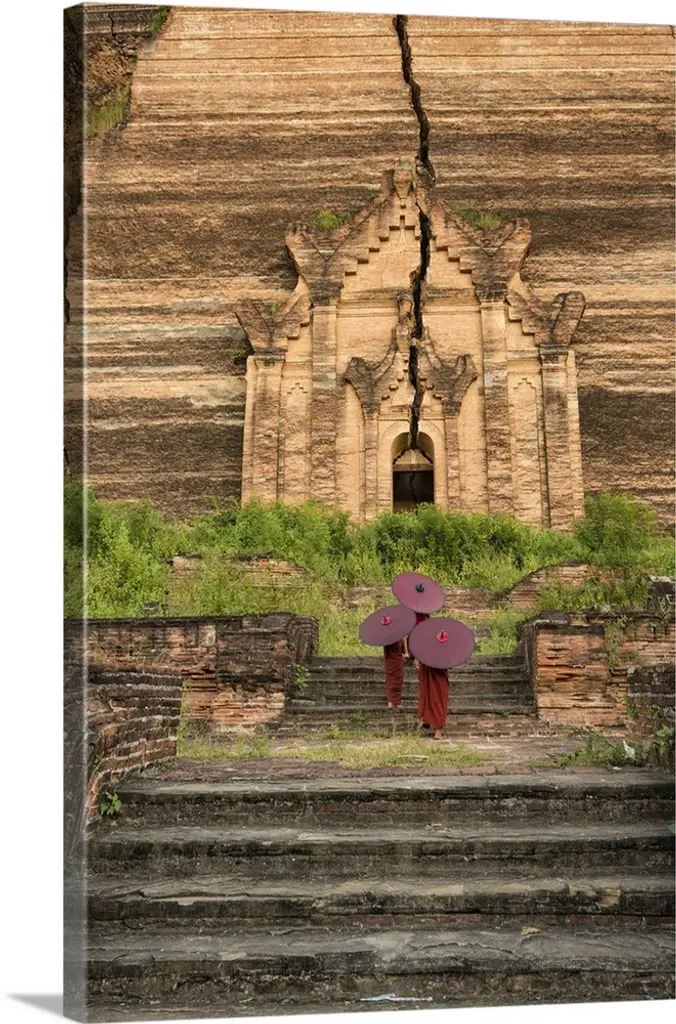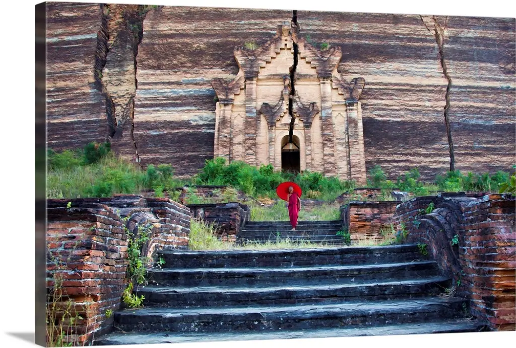 monk with parasol walking up the steps to Mingun Monastery in Burma