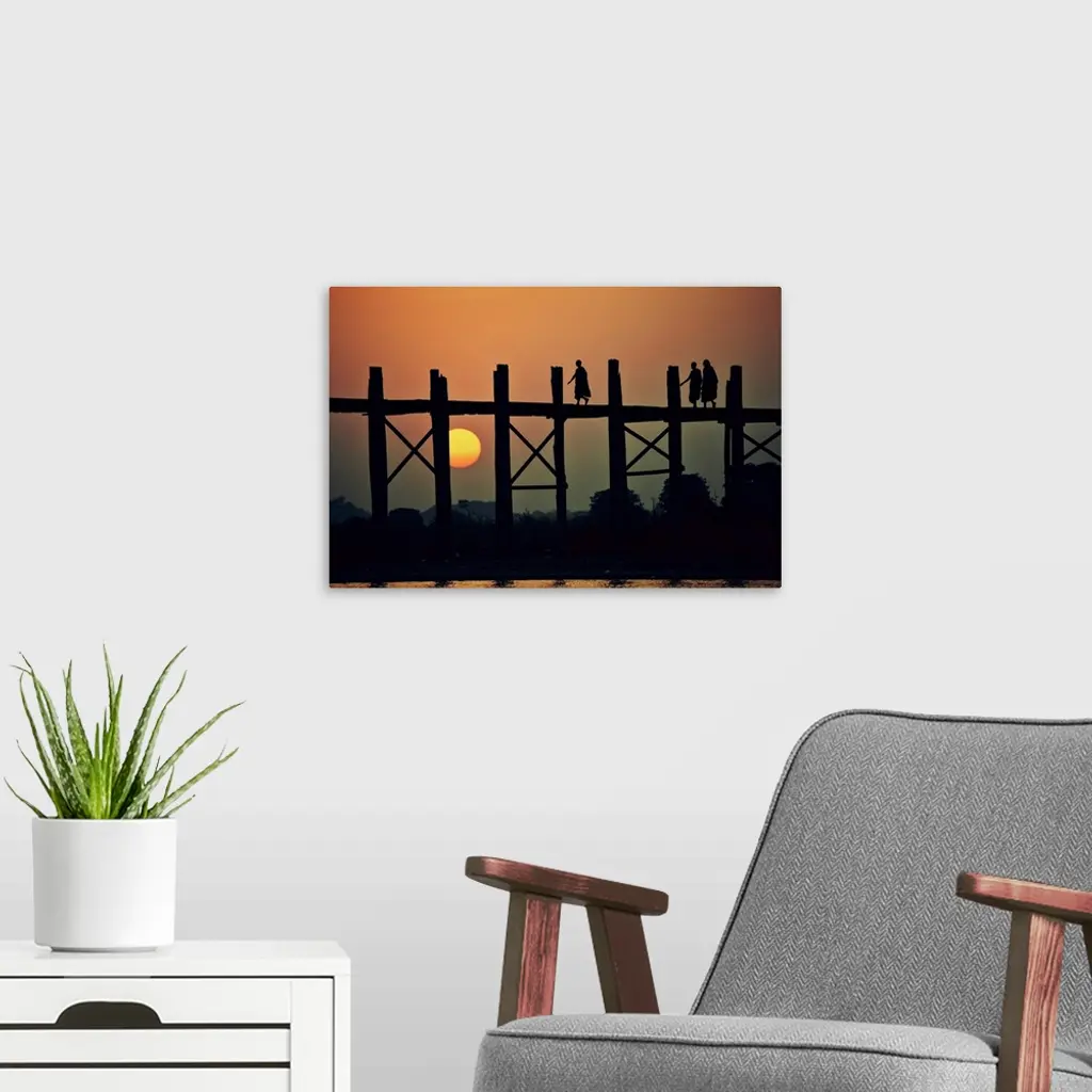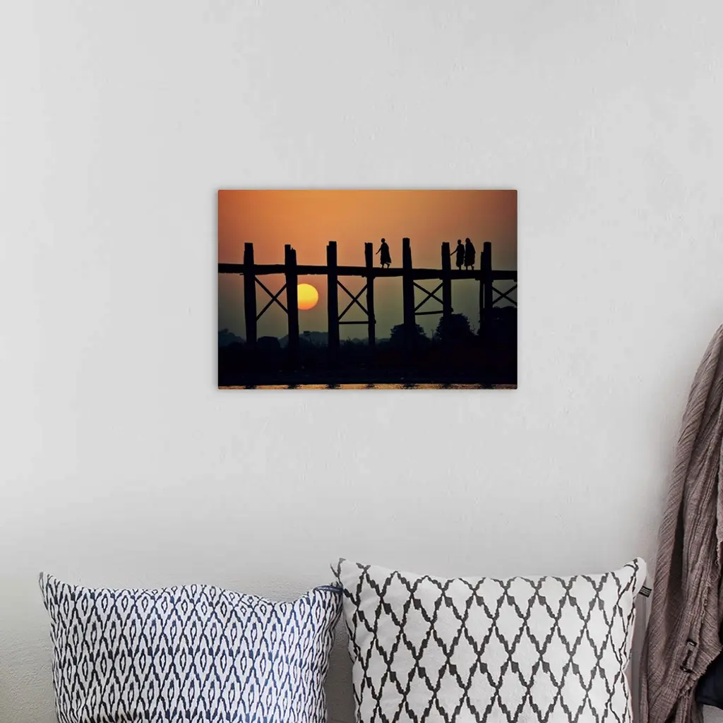 Monks Walking Across The Ubein Bridge In Burma At Sunset