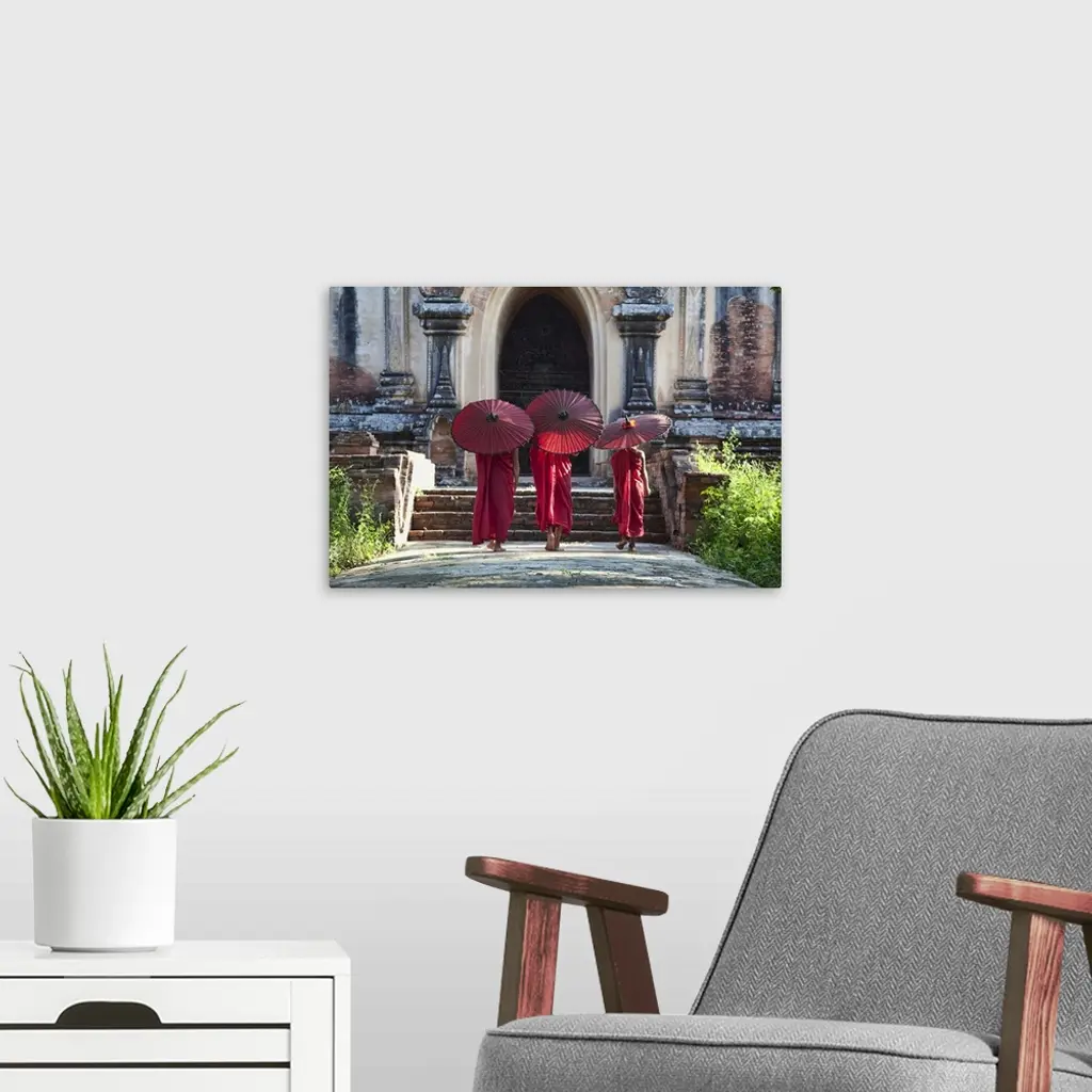 Monks with parasols by monastery in Pagan, Burma wall art for home and office decor. Discover canvas art prints, photos, mural, big canvas art and framed wall art in GreatBigCanvas.com's varied collections.