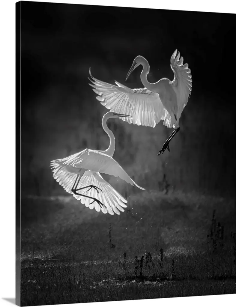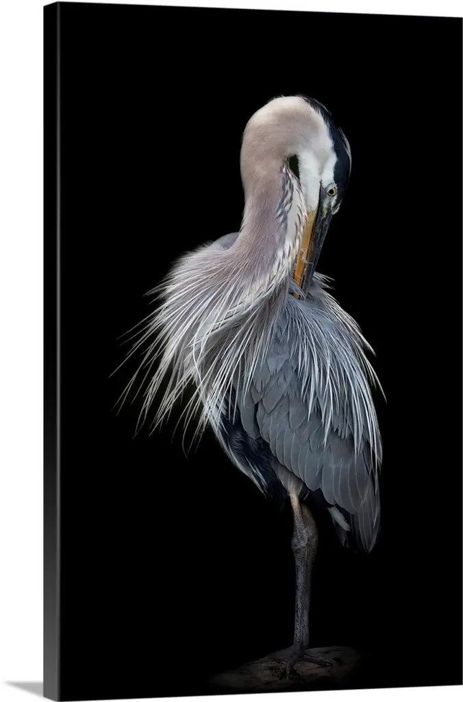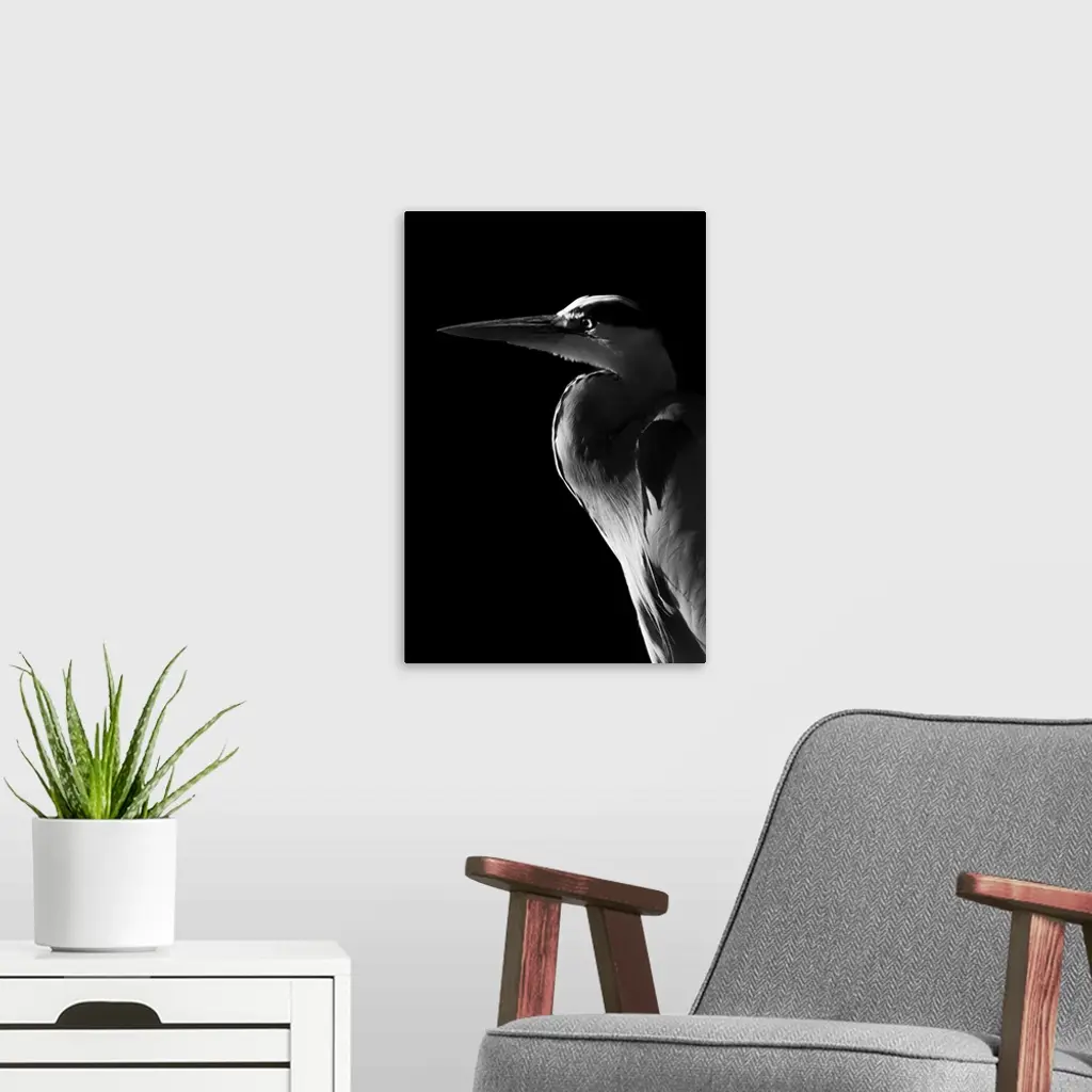 Monochrome Close-Up Of Grey Heron In Profile Against A Black Background, England