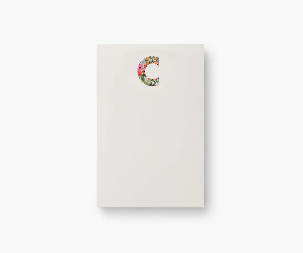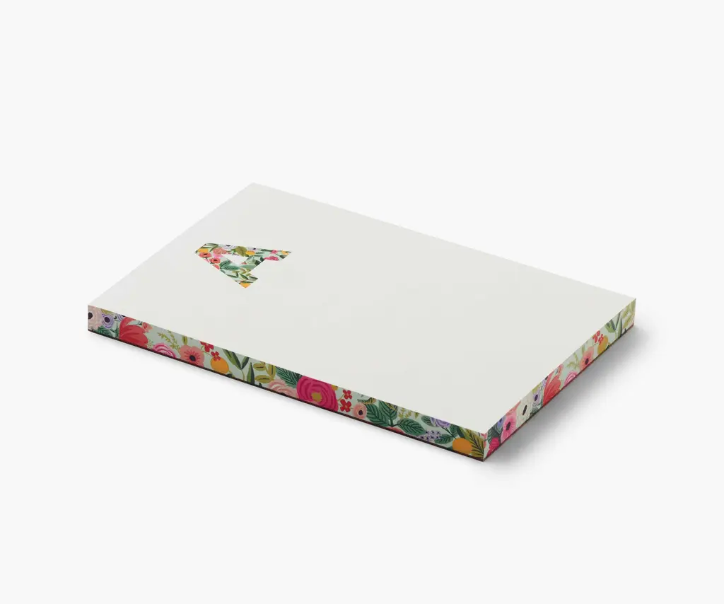 A personalized pad for your notes, memos, and to-dos. This notepad of tear-off sheets features your initial in bold, Garden Party type, with gold foil accents and painted page edges with more vibrant blooms.