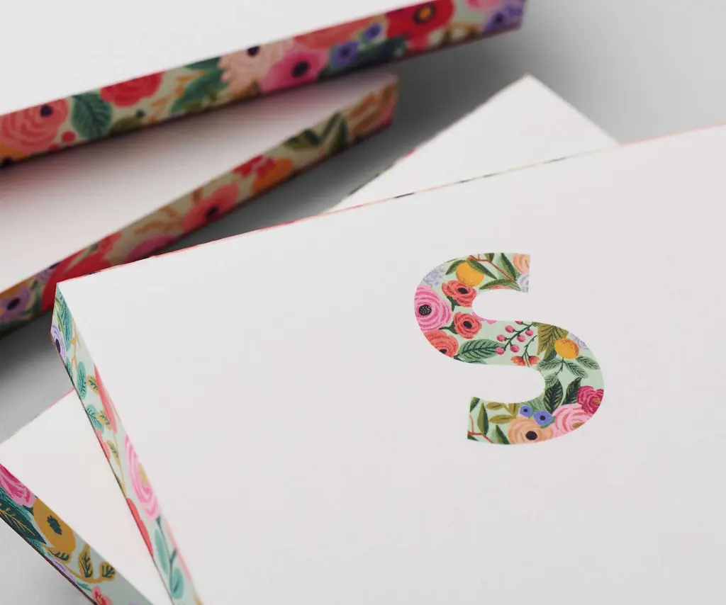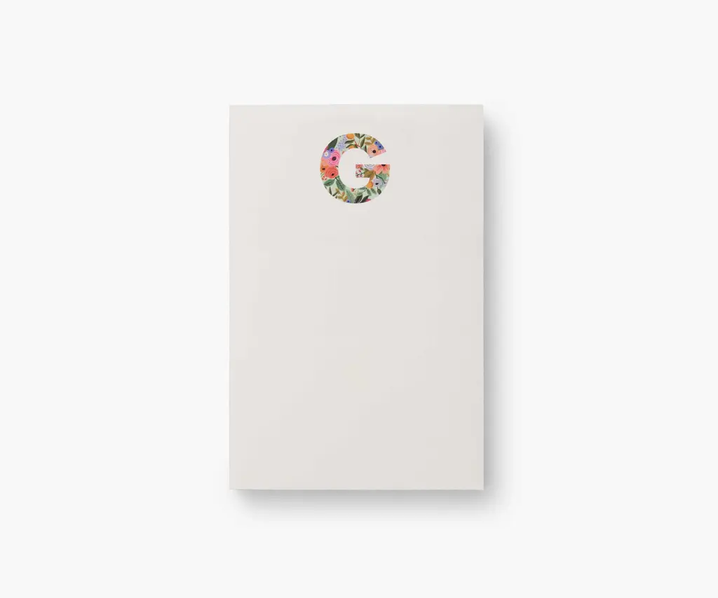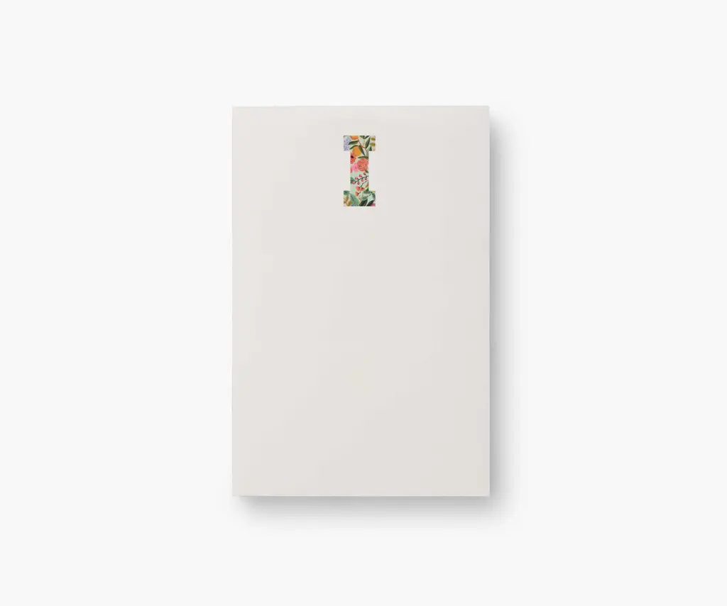 A personalized pad for your notes, memos, and to-dos. This notepad of tear-off sheets features your initial in bold, Garden Party type, with gold foil accents and painted page edges with more vibrant blooms.