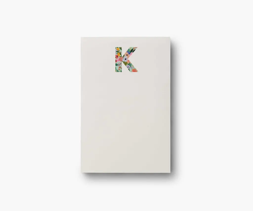 A personalized pad for your notes, memos, and to-dos. This notepad of tear-off sheets features your initial in bold, Garden Party type, with gold foil accents and painted page edges with more vibrant blooms.