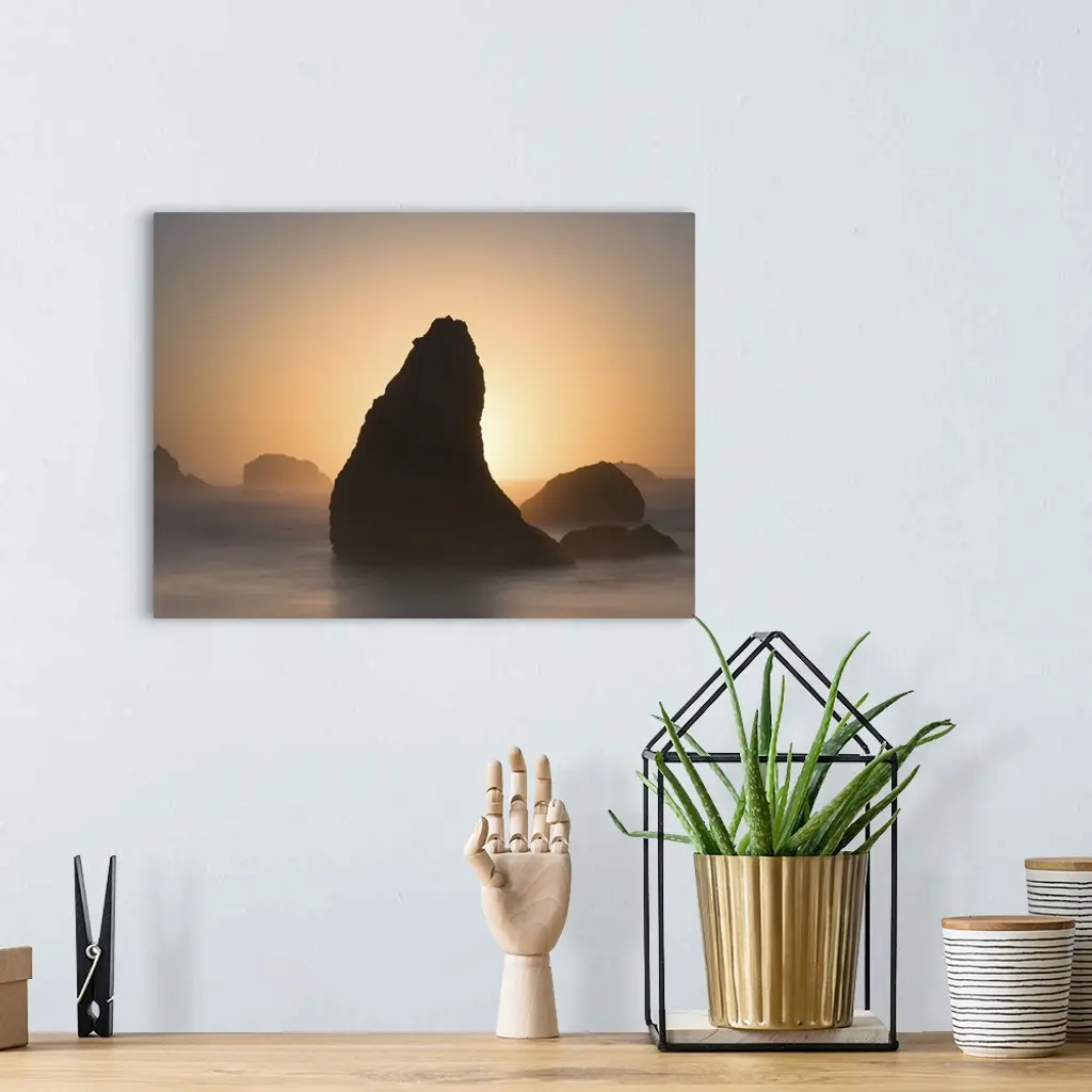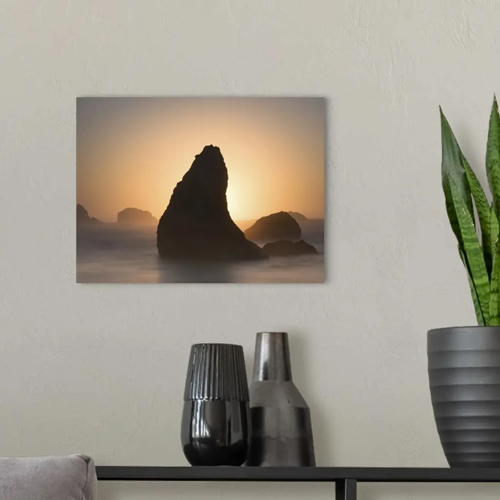 Pointed sea stack in the misty ocean in the morning, Bandon, Oregon.