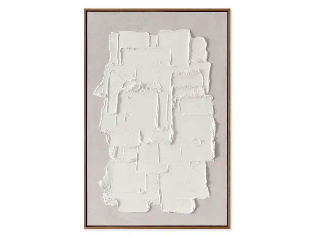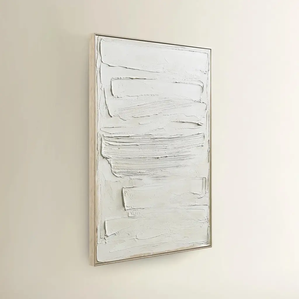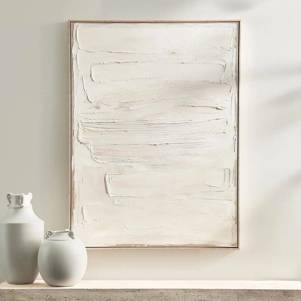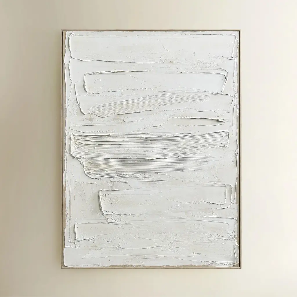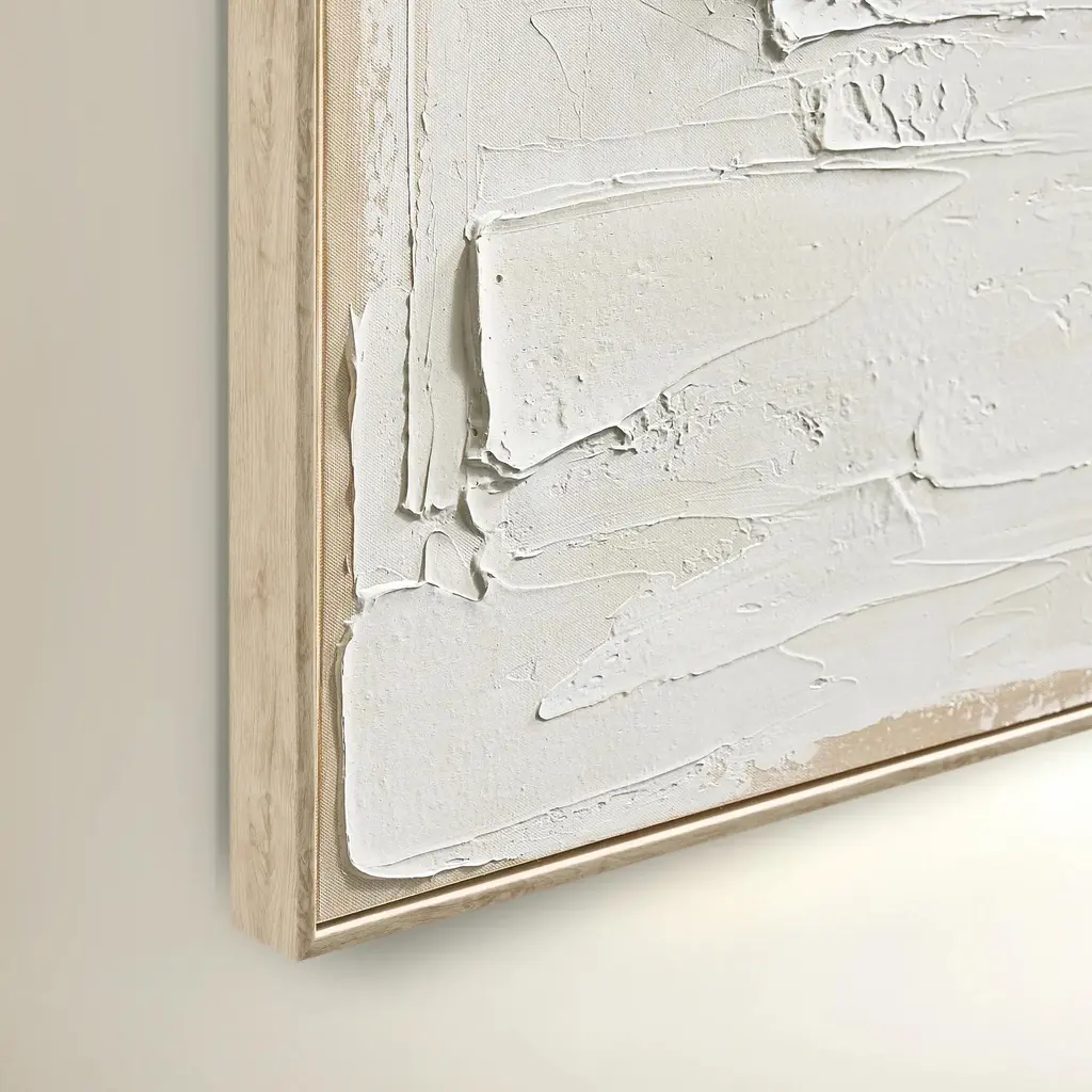 Monotype Canvas 1 is a serene exploration of light and texture. Layers of white tones create a mesmerizing depth, while the textured paint adds visual intrigue. Framed in a whitewashed wood frame, this abstract piece exudes understated elegance.