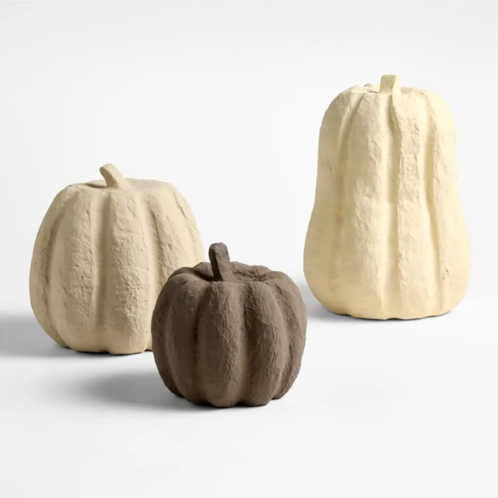 Our Monroe collection transforms scrap fabric into a patch's worth of paper-mache pumpkins. Skilled artisans press fabric pulp into a charmingly organic shape, which is then painted by hand with a matte finish in creamy ivory. Lightweight and highly textured, the small pumpkin layers with our other exclusive squashes and gourds to set an autumnal mood throughout the Halloween and Thanksgiving seasons.