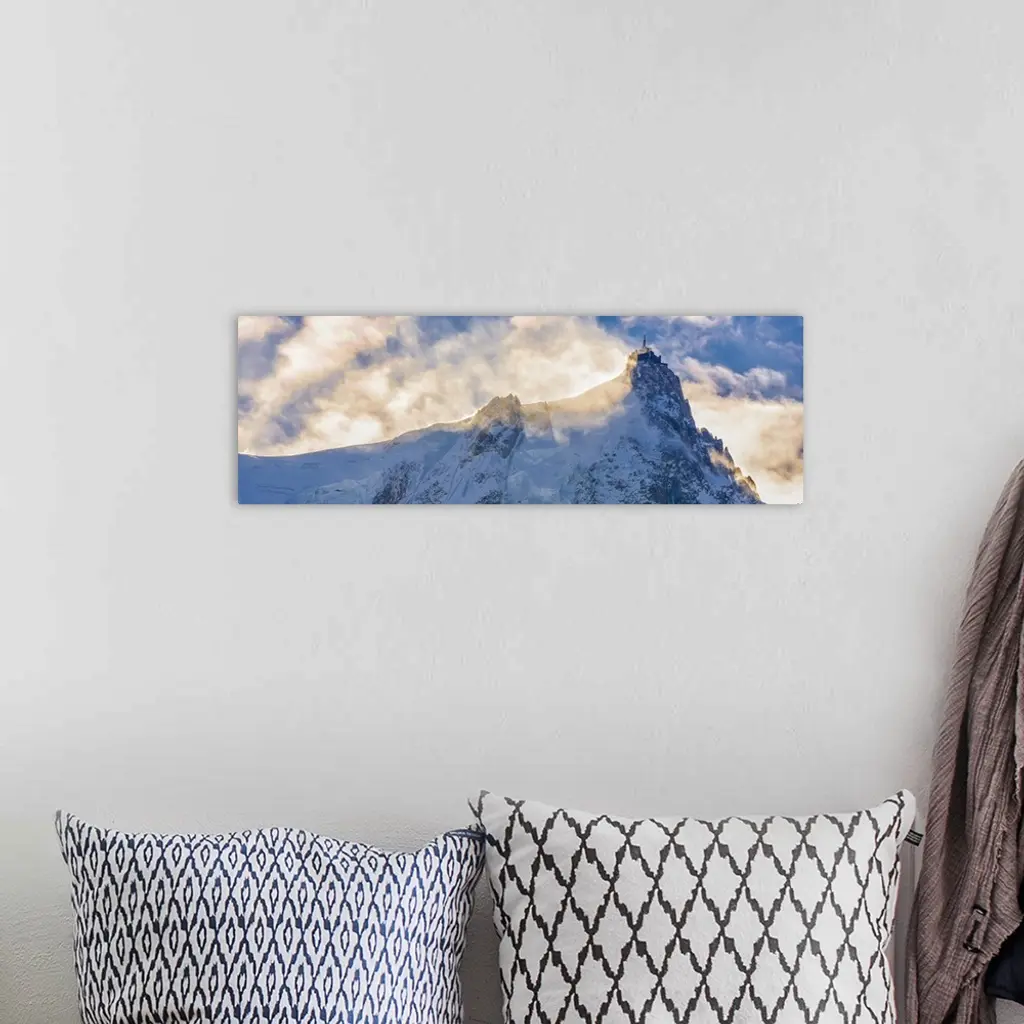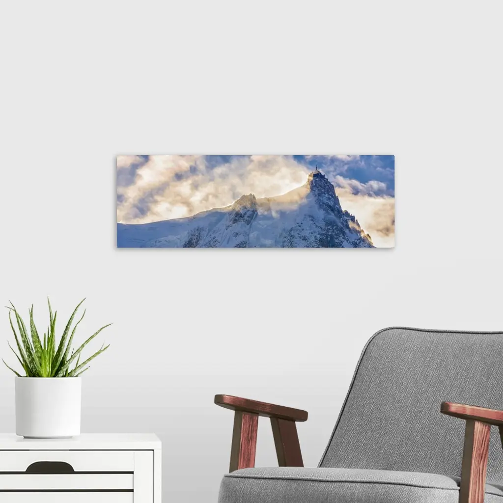 Photograph of Mont Blanc surrounded by sunlit clouds.