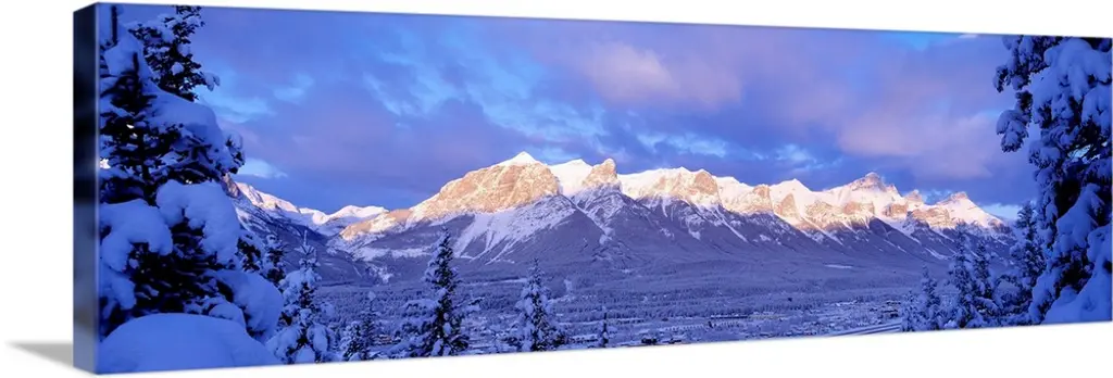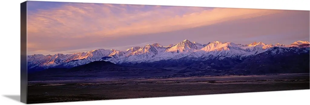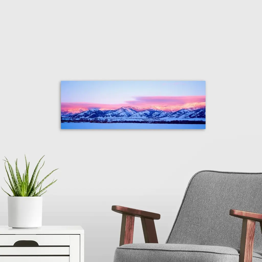 A panoramic snowscape photograph of plains and clouds passing over mountains at the end of the day.