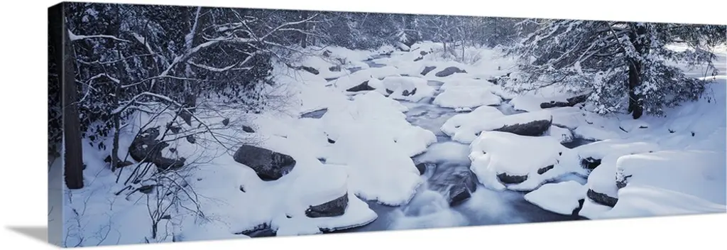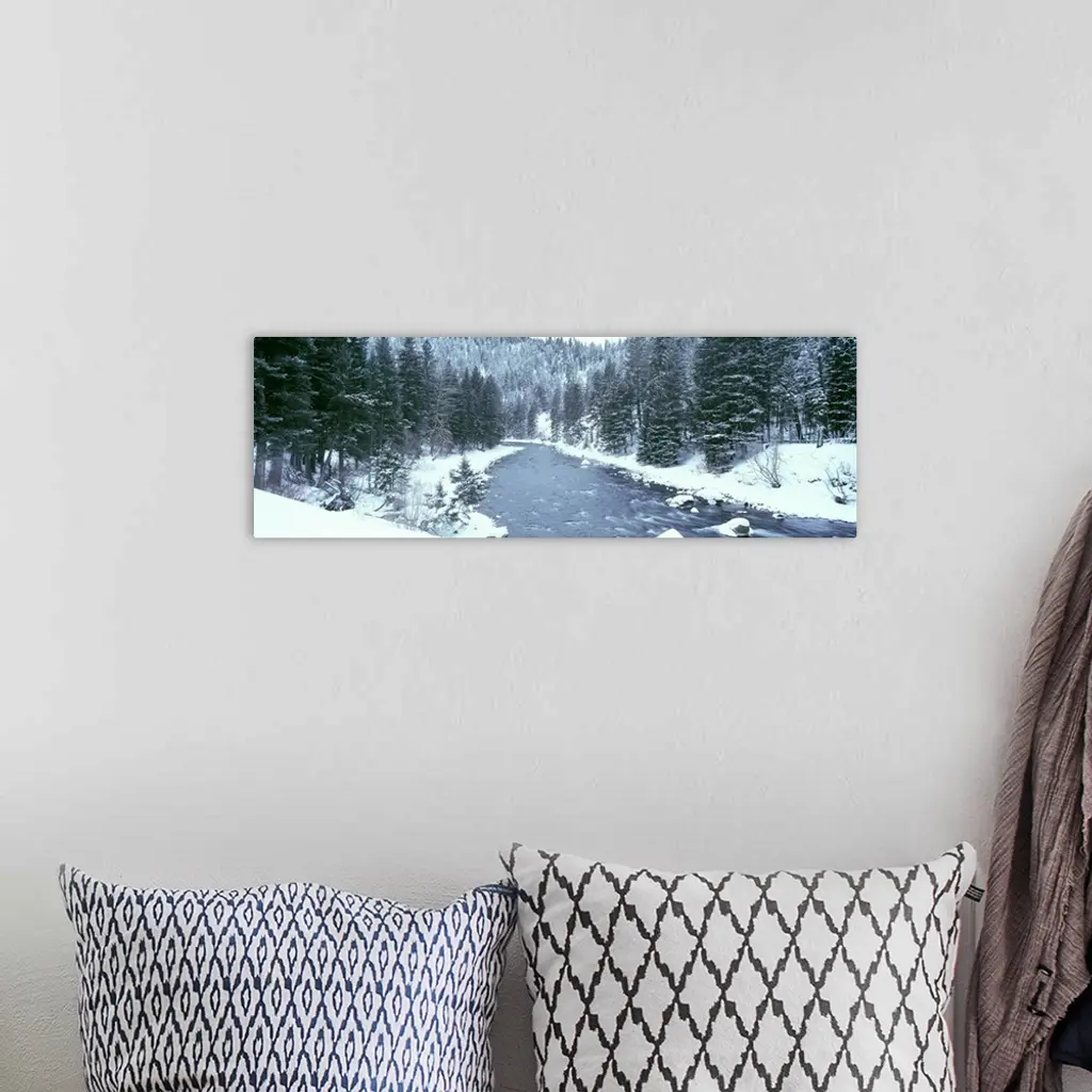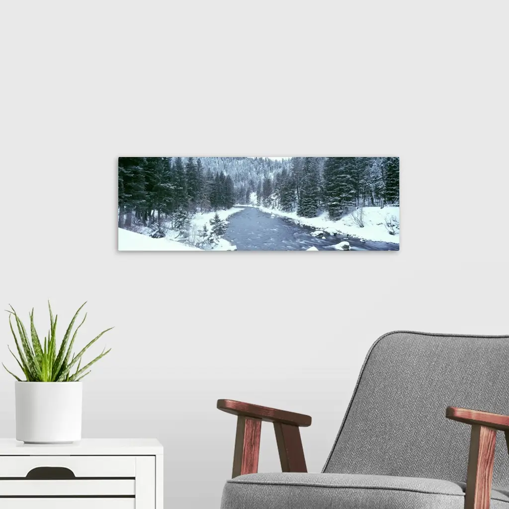 This large panoramic shot was taken of a river during winter with the land covered in snow beside it and pine trees lining the bank.