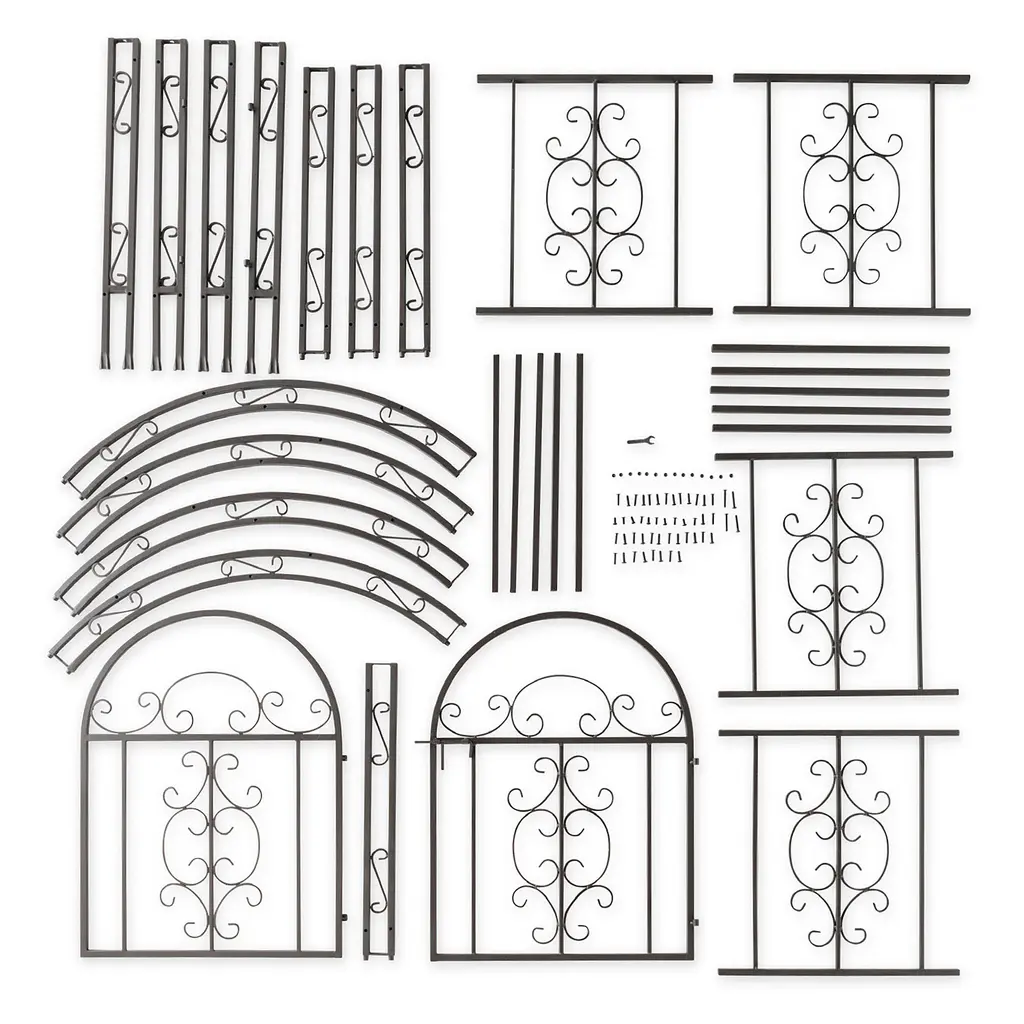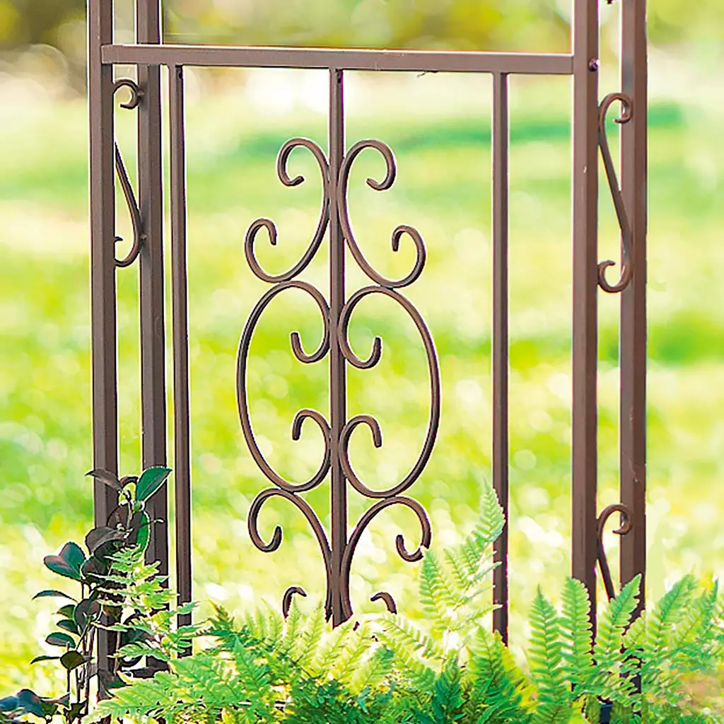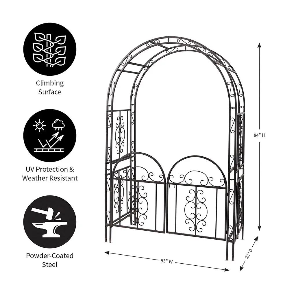 Our Montebello Garden Arbor with Gate is beautifully crafted with intricate scrollwork that will bring style to your garden even without a flowering display. The design is reminiscent of the ornate wrought-iron designs that adorn the windows and gates of Turkish homes. Scrolls and curlicues intertwine along the frame to create beautiful support for roses, clematis, honeysuckle, wisteria and other climbers. Our Montebello Arbor not only provide great support for flowers and vines, it adds structure and style to your yard or garden. The graceful arch and side panels showcase your flowering vines and climbers, while the wide width offers a generous opening to any space. Two-piece gate with latch creates an elegant entrance. This square tubular metal arch has rustproof stainless hardware and the best-quality, burnished gunmetal finish. Our Montebello Garden Arbor comes with 7" ground stakes to ensure stability. Assembly required.