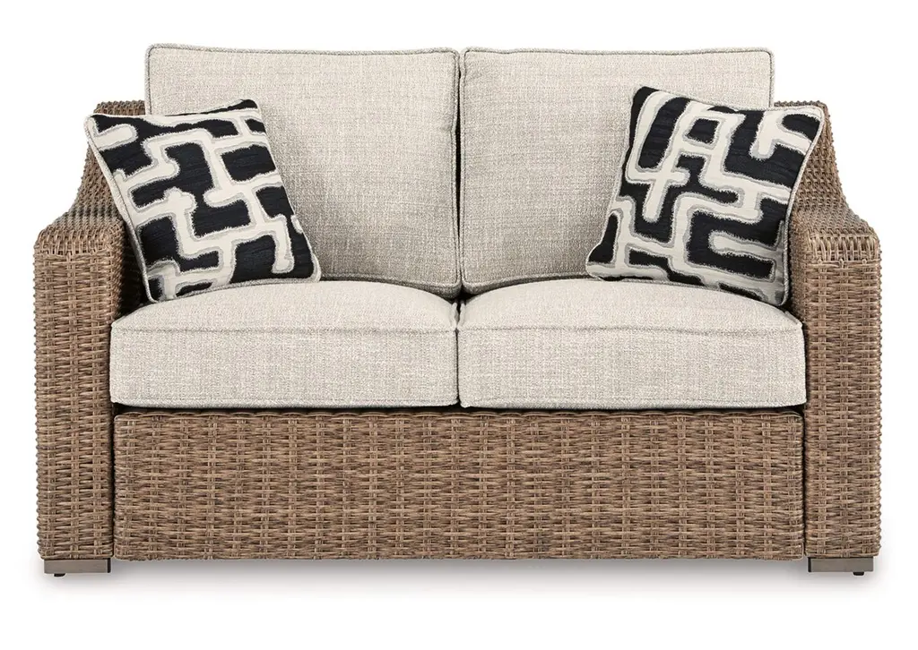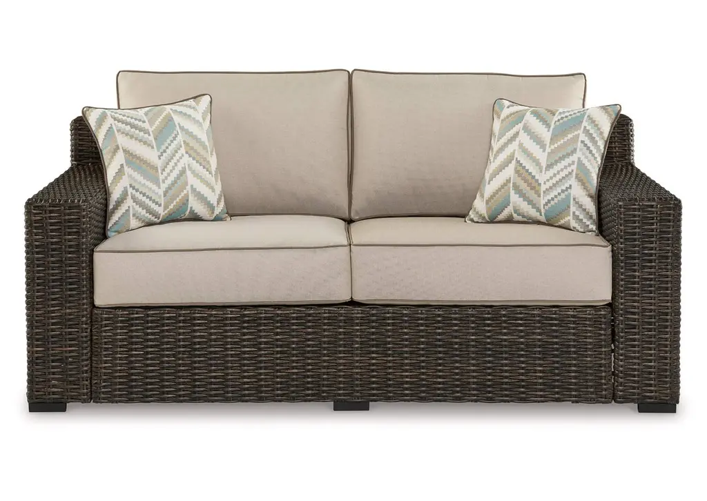 The Montecello sofa from Cindy Crawford Home beautifully combines casual beachside living and contemporary style. All-weather woven wicker over a fully-welded rustproof aluminum frame boasts driftwood-inspired shades of gray, tan and brown. Durable performance fabric covered cushions in a twine color are colorfast, mold and mildew resistant for durable outdoor use. Decorative toss pillows add a beautiful designer touch.