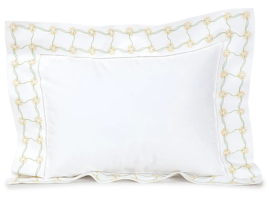 As fresh as if borne on a spring breeze, winsome daisies, delicately hand-embroidered in Pink or Yellow, are linked by a latticework of greenery. This gossamery design decorates a luxurious 600 thread count, 100% Egyptian cotton percale from Italy. Imported, complete with flanged edges, mitered corners and delicate hemstitching. Truly museum quality.
