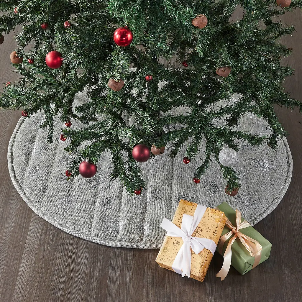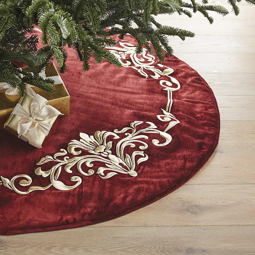Our Montreal tree skirt offers a fresh take on timeless style with the luxe touch of velvet. A delicate floral motif adorns an open field, layering the perfect touch of pattern under your tree.