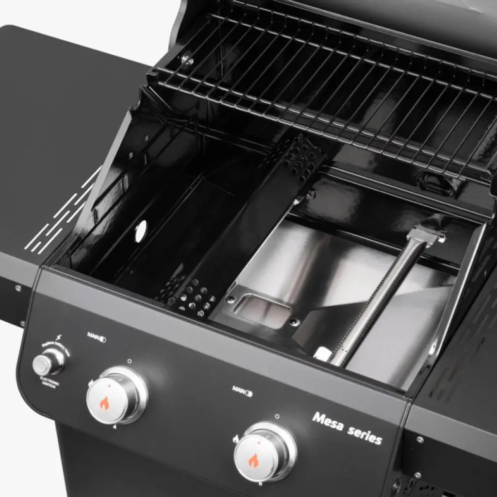 Prepare to take your barbecuing to the next level with our 2-Burner Mesa Series grill. This grill, featuring our signature clear-view lid and two stainless steel burners, delivers a whopping 24,000 BTUs of heat, ensuring your food is cooked to perfection every time. The side shelves also fold down to make storage even more effortless.