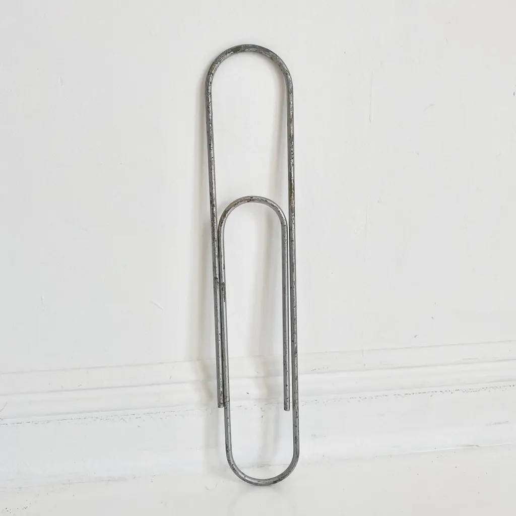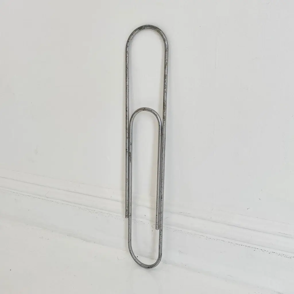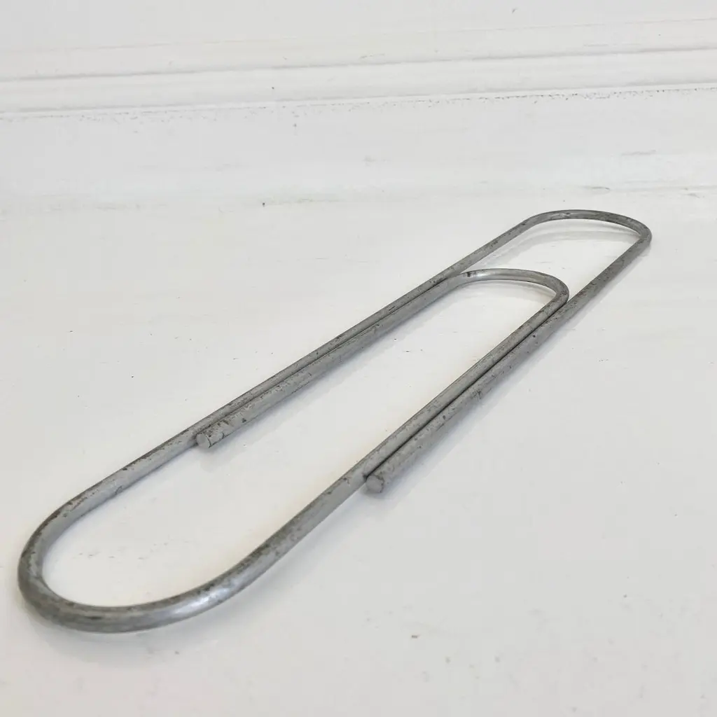 Giant metal paperclip slightly under 1.5 ft tall. Quirky accent piece or wall art. Good weight to object. Slight wear to metal exterior. Good vintage condition. Two available. Priced individually. Slightly different age/patina to both.