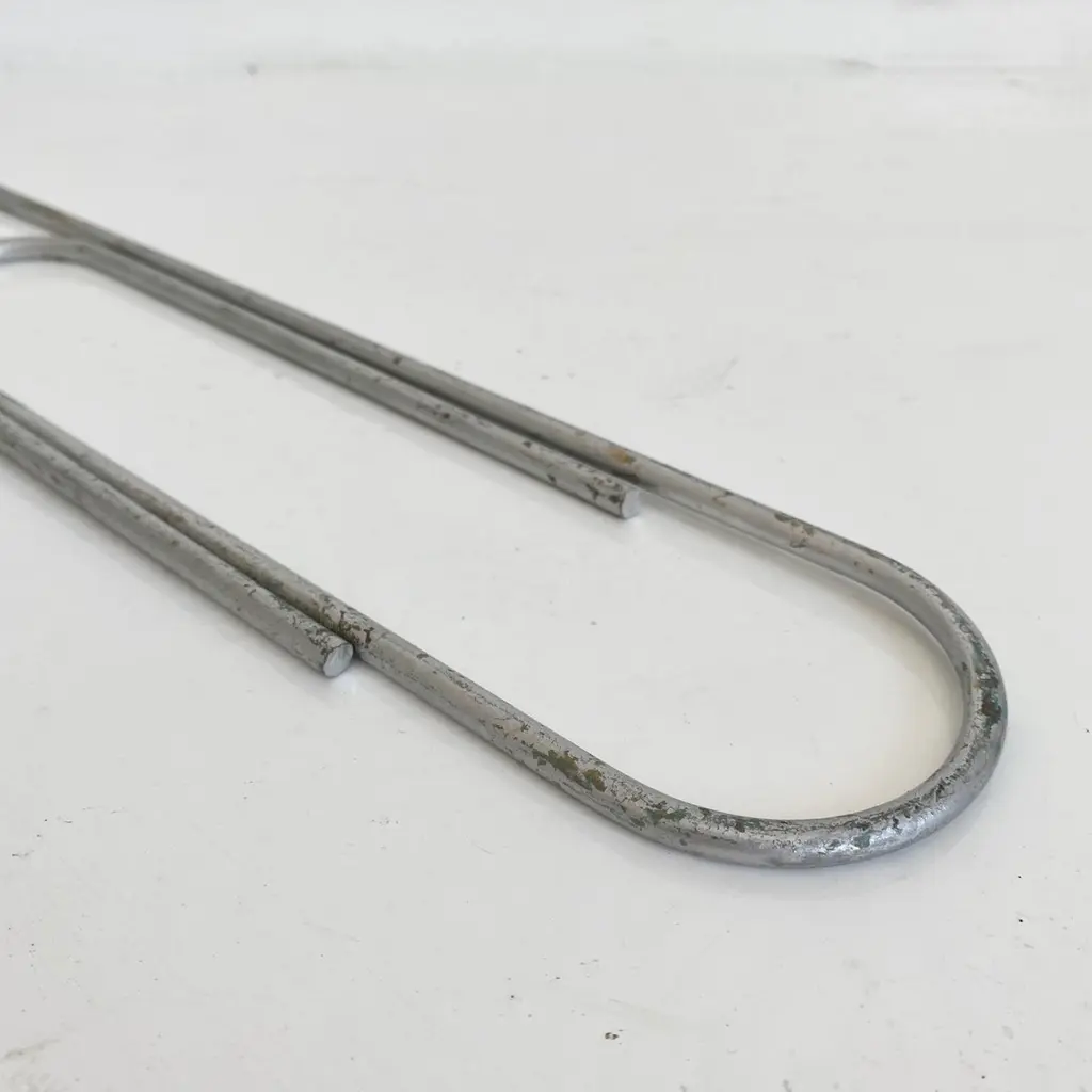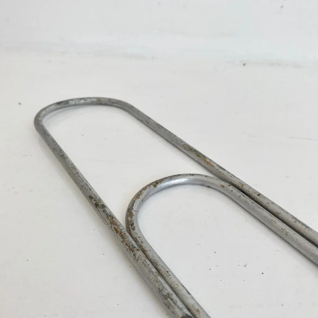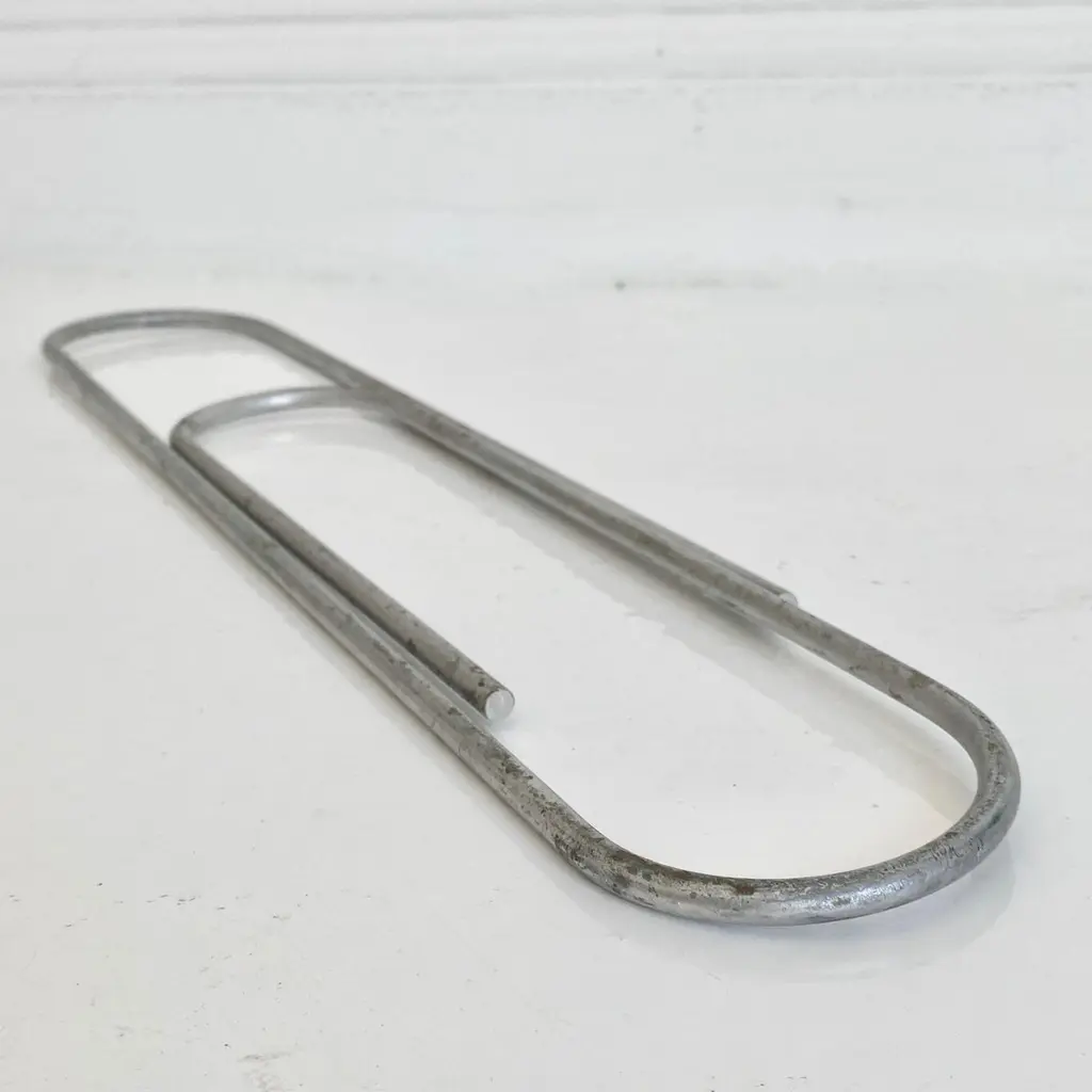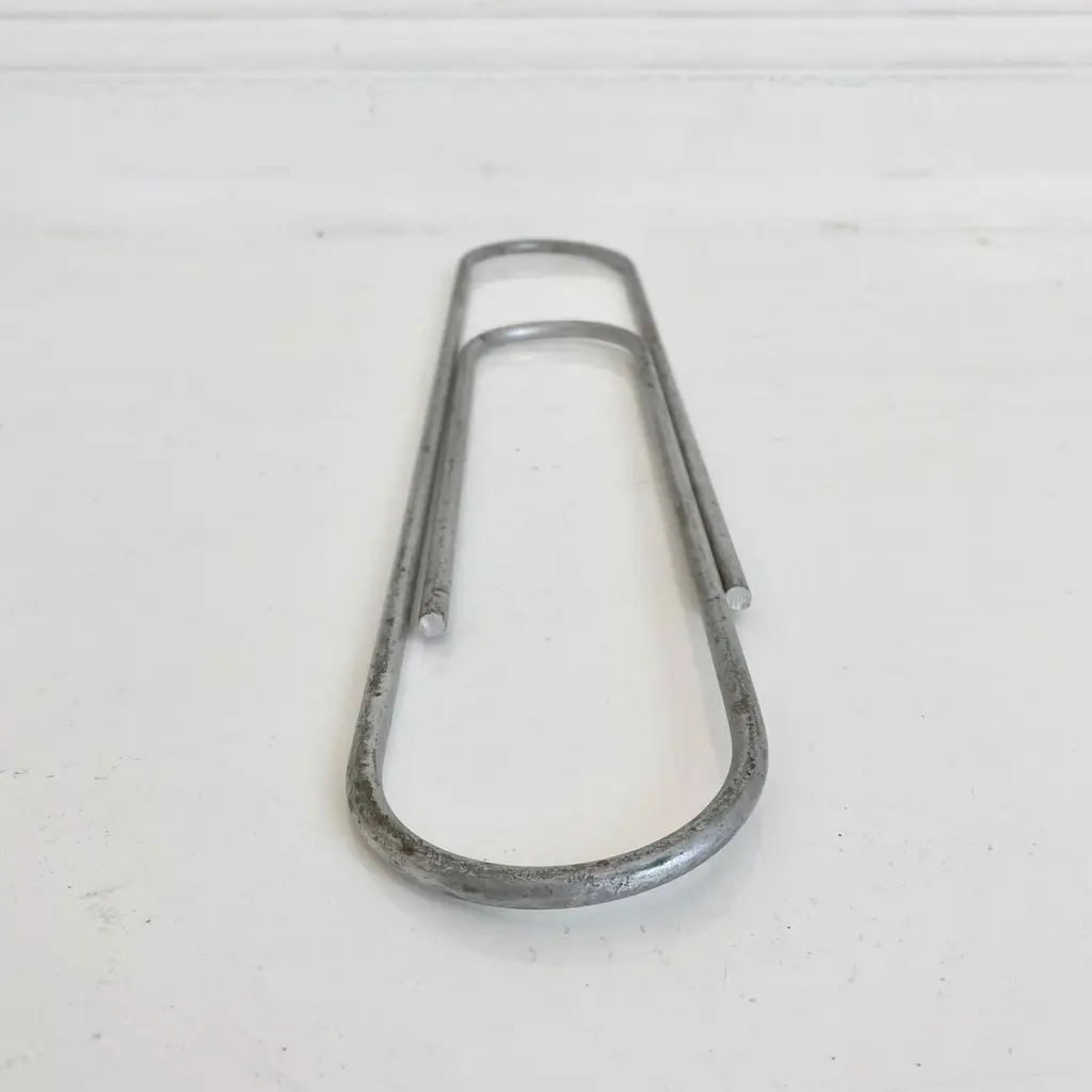 Giant metal paperclip slightly under 1.5 ft tall. Quirky accent piece or wall art. Good weight to object. Slight wear to metal exterior. Good vintage condition. Two available. Priced individually. Slightly different age/patina to both.