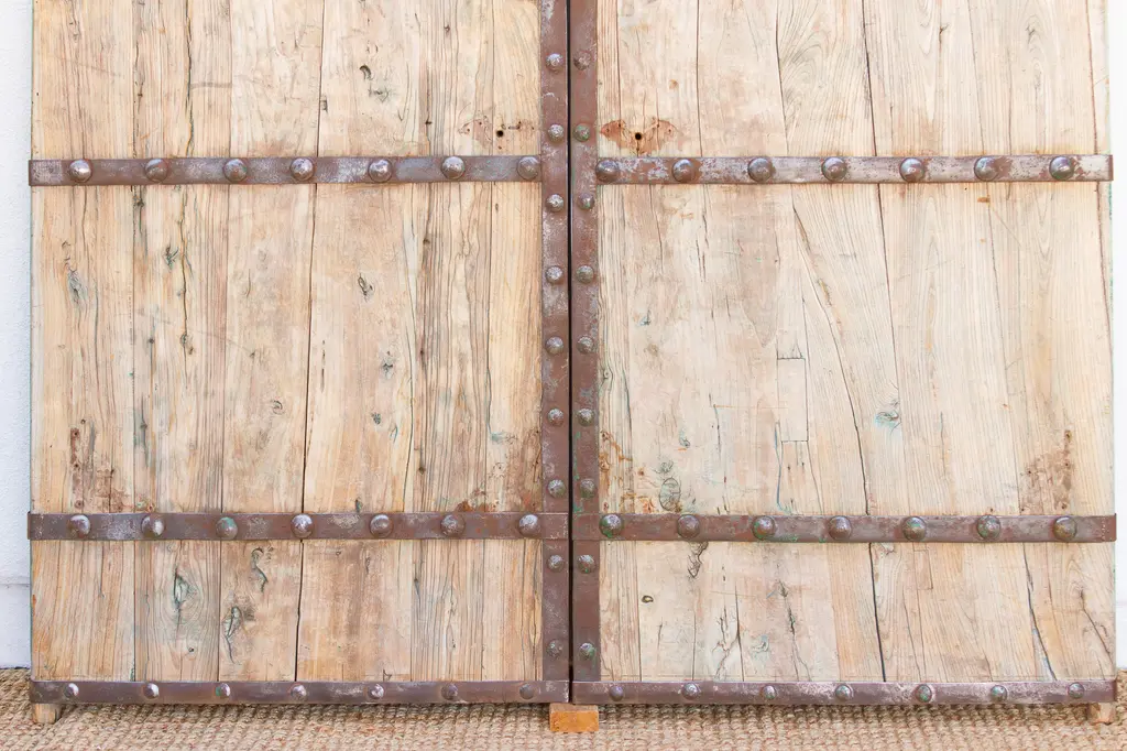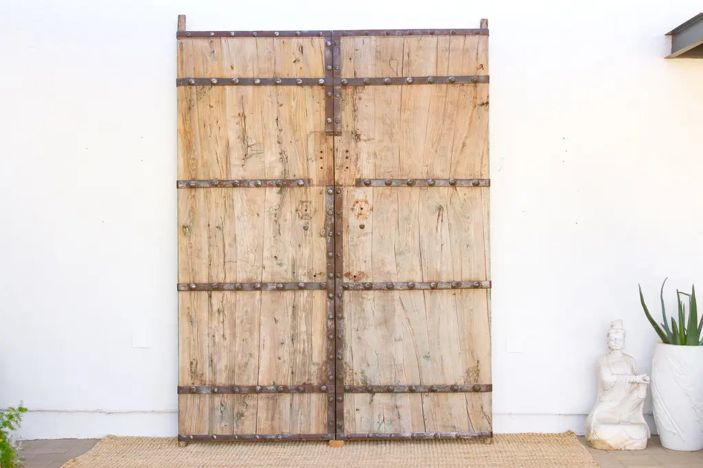 Step into history with this stunning pair of antique doors, measuring 103" high and 78" wide. Likely from Northern China, Mongolia, or the Himalayas, these reclaimed doors showcase durable craftsmanship with wide wood planks and bold iron straps secured by large rivets. The weathered wood’s rich patina contrasts beautifully with dark, hand-forged metalwork. Their worn details and missing hardware highlight their authentic, storied past.