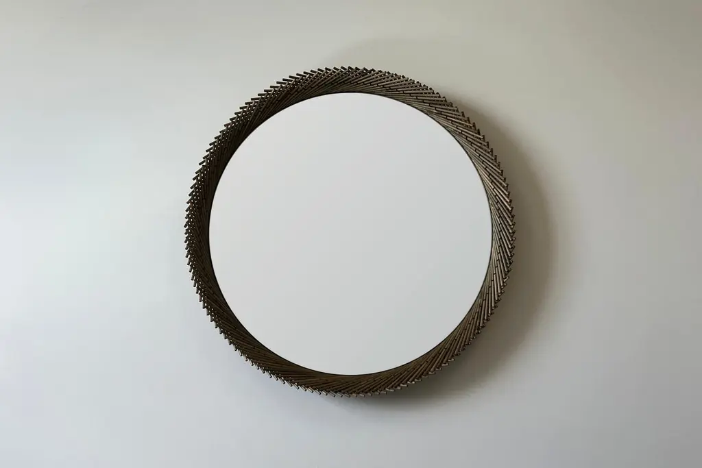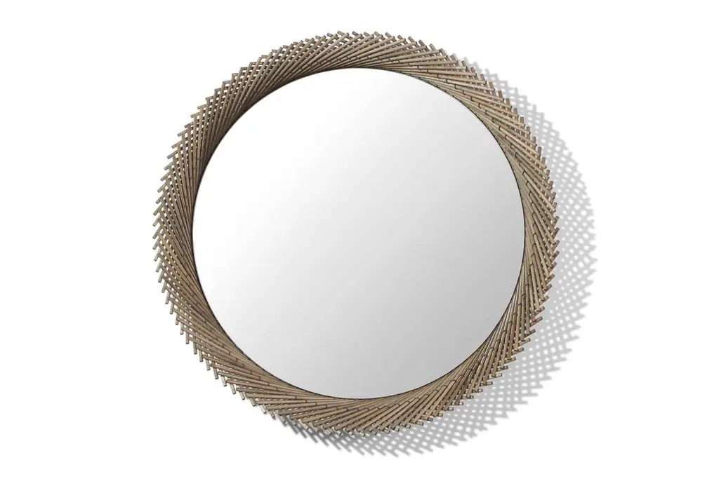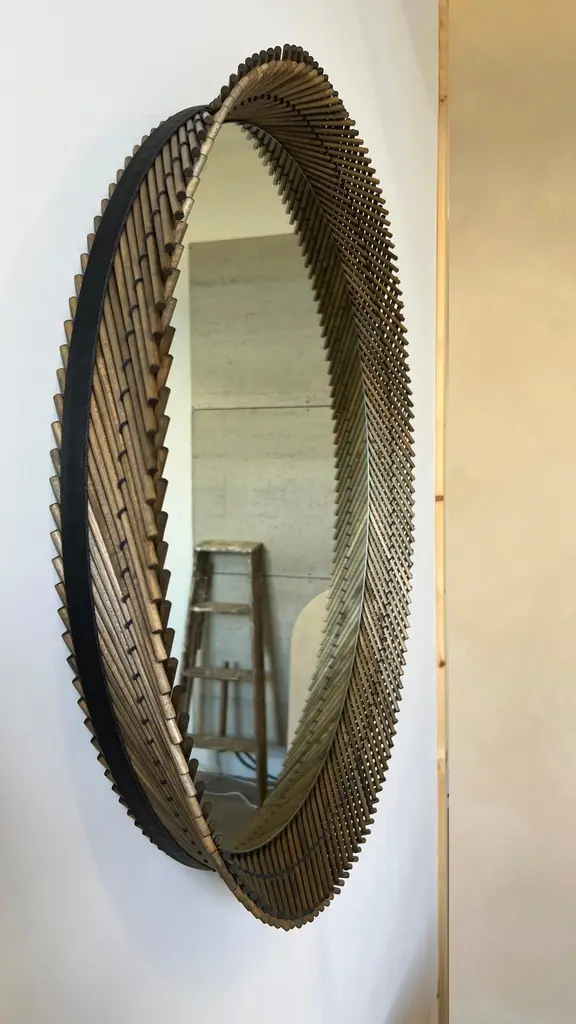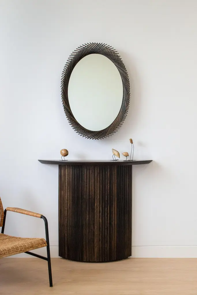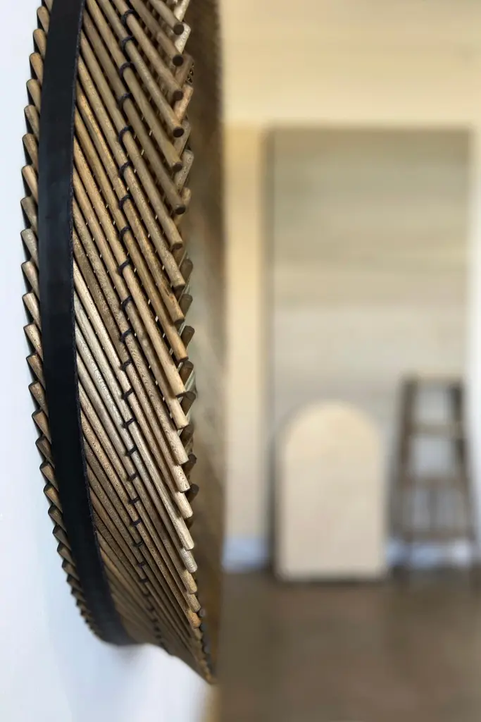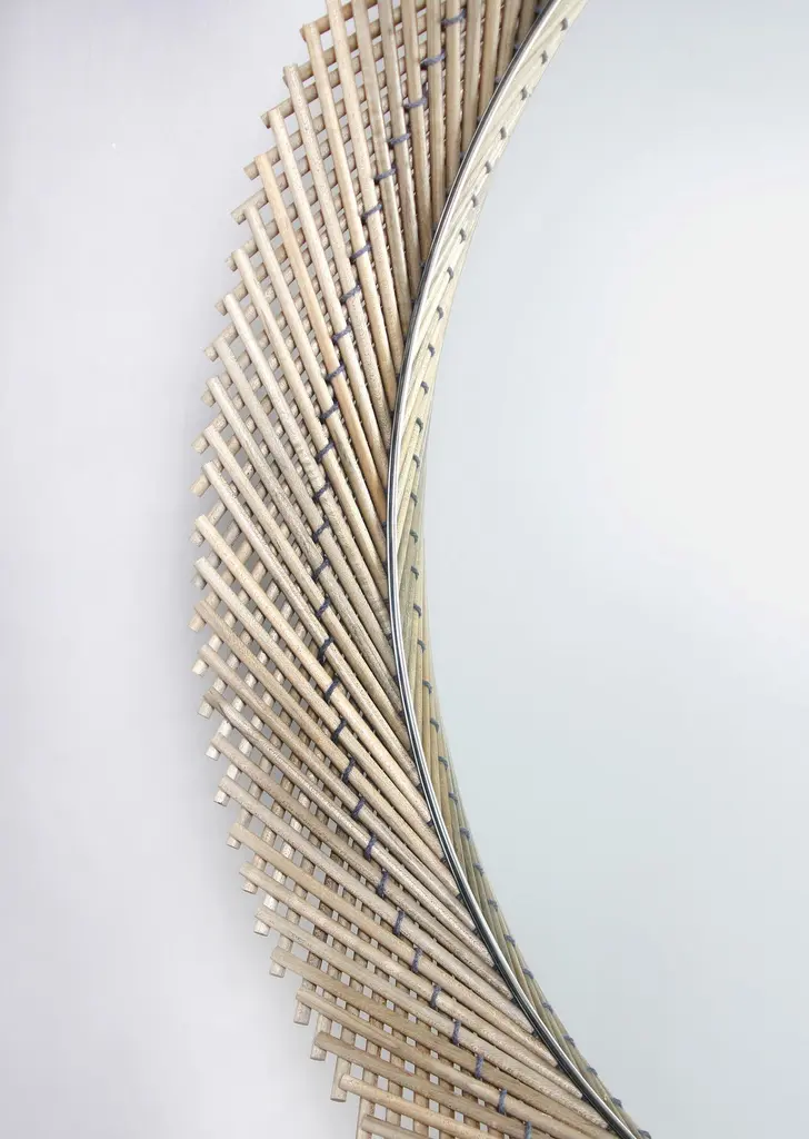 The Mooda Mirror is composed of a set of dowels stitched together to create a beautiful geometric edge around the glass. The mirror in turn reflects the dowels along its circumference, completing the traditional form of the Mooda. Available in two American hardwoods, three standard sizes and a range of finishes, they are perfect for powder rooms, hallways or above a mantle. The Mooda Collection reimagines a traditional furniture building technique used for centuries across India into contemporary objects. Sticks of cane, bamboo or grass are stitched together with rope to create structural forms used as stools, chairs or tables. Every region has its own distinct style and variation of technique based on the materials available, making these stools both ubiquitous and individual in their origin. Learning this technique that has been passed down through generations, the Mooda Collection explores ways in which this process and the resulting form can be used beyond seating to develop contemporary objects.