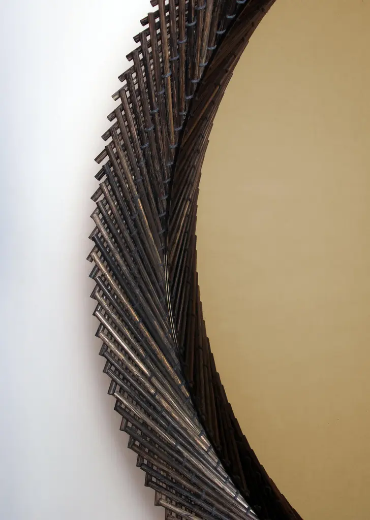 The Mooda Mirror is composed of a set of dowels stitched together to create a beautiful geometric edge around the glass. The mirror in turn reflects the dowels along its circumference, completing the traditional form of the Mooda. Available in two American hardwoods, three standard sizes and a range of finishes, they are perfect for powder rooms, hallways or above a mantle. The Mooda Collection reimagines a traditional furniture building technique used for centuries across India into contemporary objects. Sticks of cane, bamboo or grass are stitched together with rope to create structural forms used as stools, chairs or tables. Every region has its own distinct style and variation of technique based on the materials available, making these stools both ubiquitous and individual in their origin. Learning this technique that has been passed down through generations, the Mooda Collection explores ways in which this process and the resulting form can be used beyond seating to develop contemporary objects.
