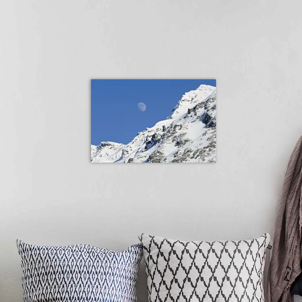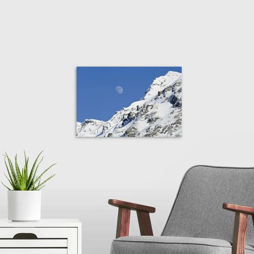 Moon rising over snow covered mountain peak at Hatcher Pass in Southcentral Alaska.