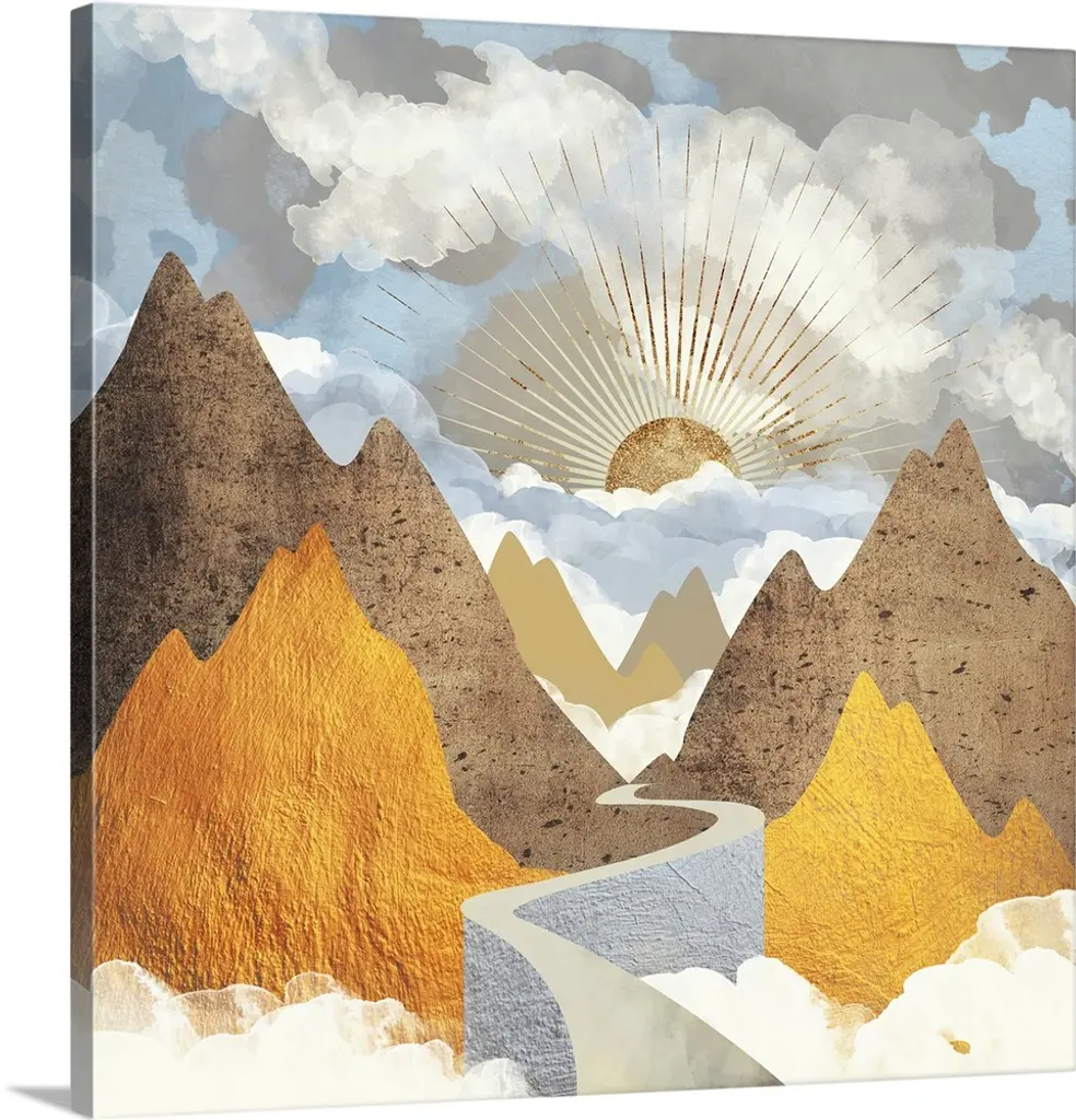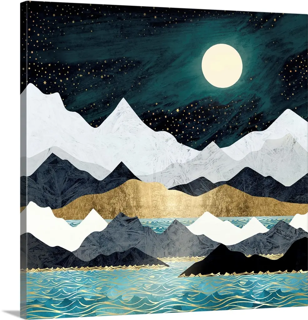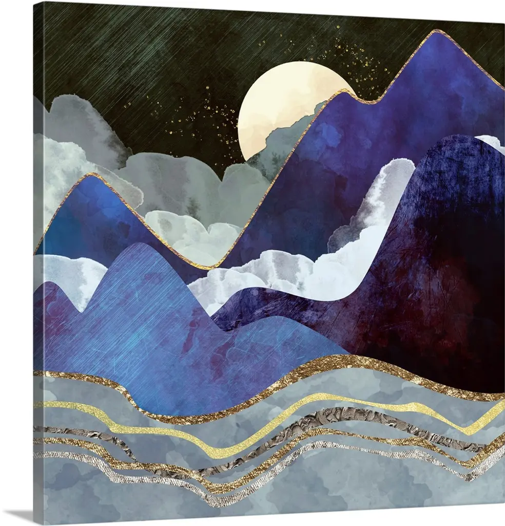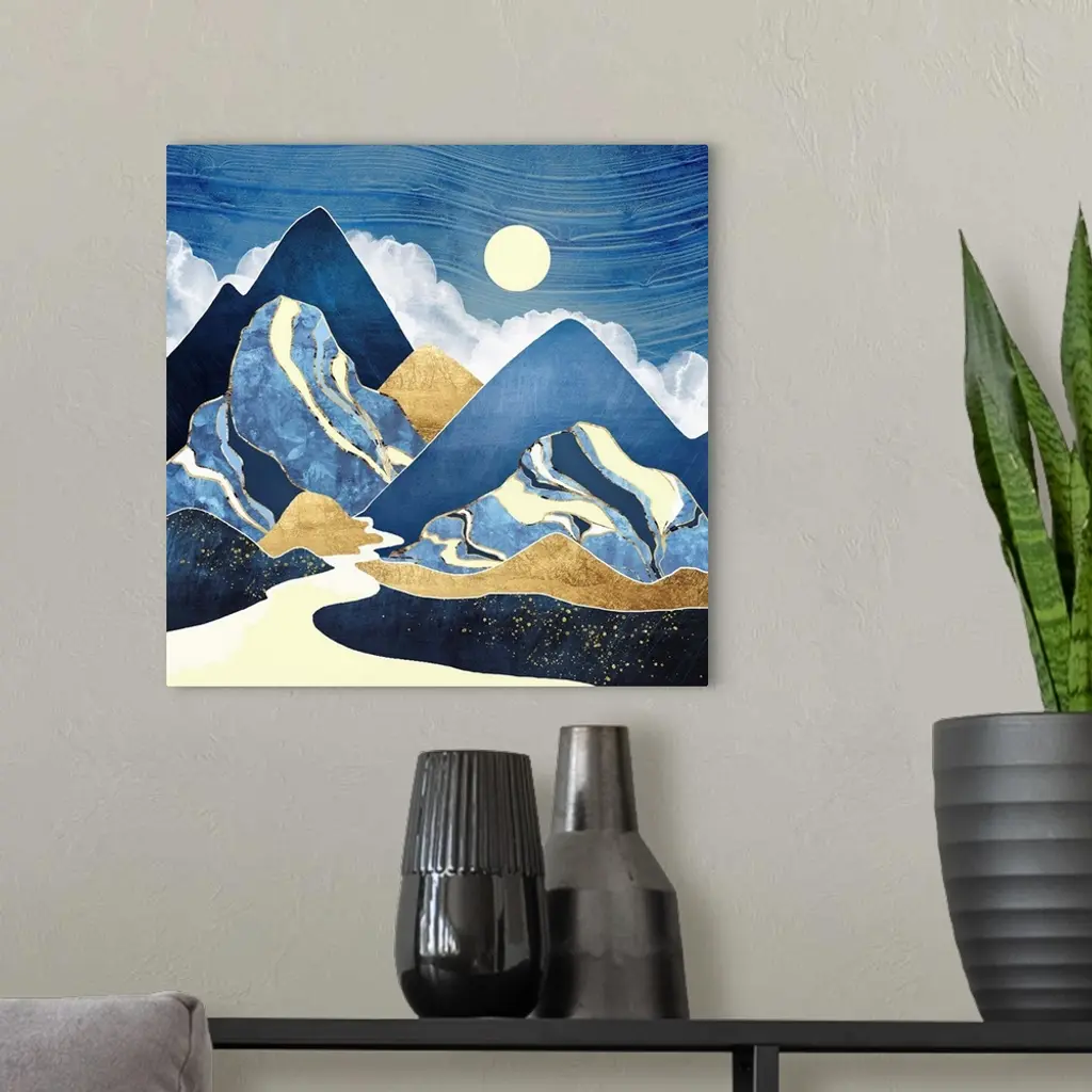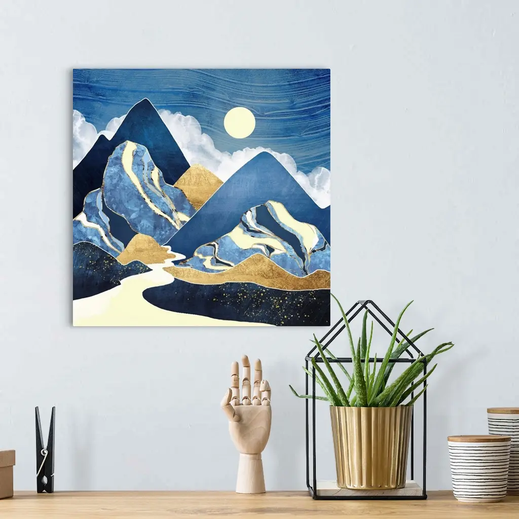 Abstract landscape with mountains, river, moon, blue, gold and yellow.