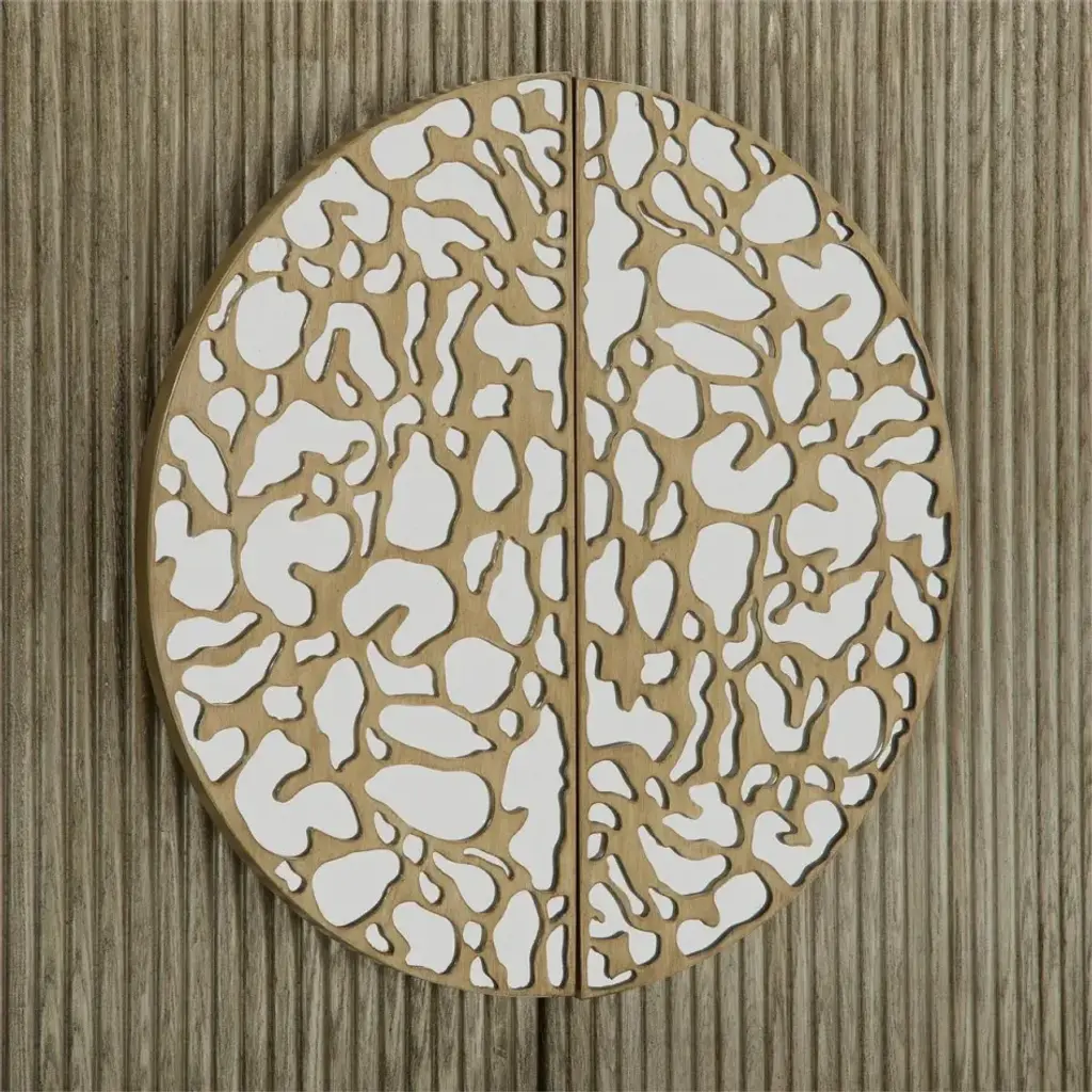 The Moon Shadow Four-Door Credenza is a gorgeous statement piece that exudes opulent style. A stunning wooden frame features a fluted pattern in a silver white finish that envelops the piece. A stylish metallic accent showcasing an organic pattern in Valyrian Gold is overlain atop mirrored glass, complementing both the mirrored tabletop and golden plinth base. This elegant design statement features four push-latch doors with European hinges, as well as three interior compartments with a single adjustable shelf.