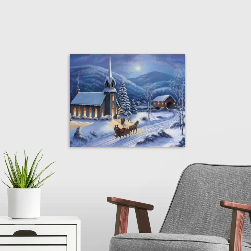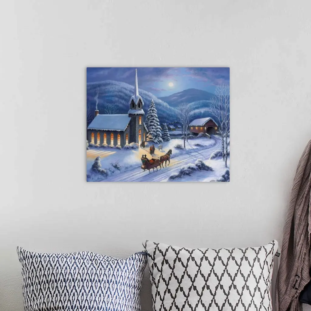 Snow, church, moon, covered bridge, horse and sledChristmas, winter