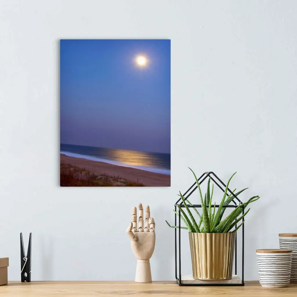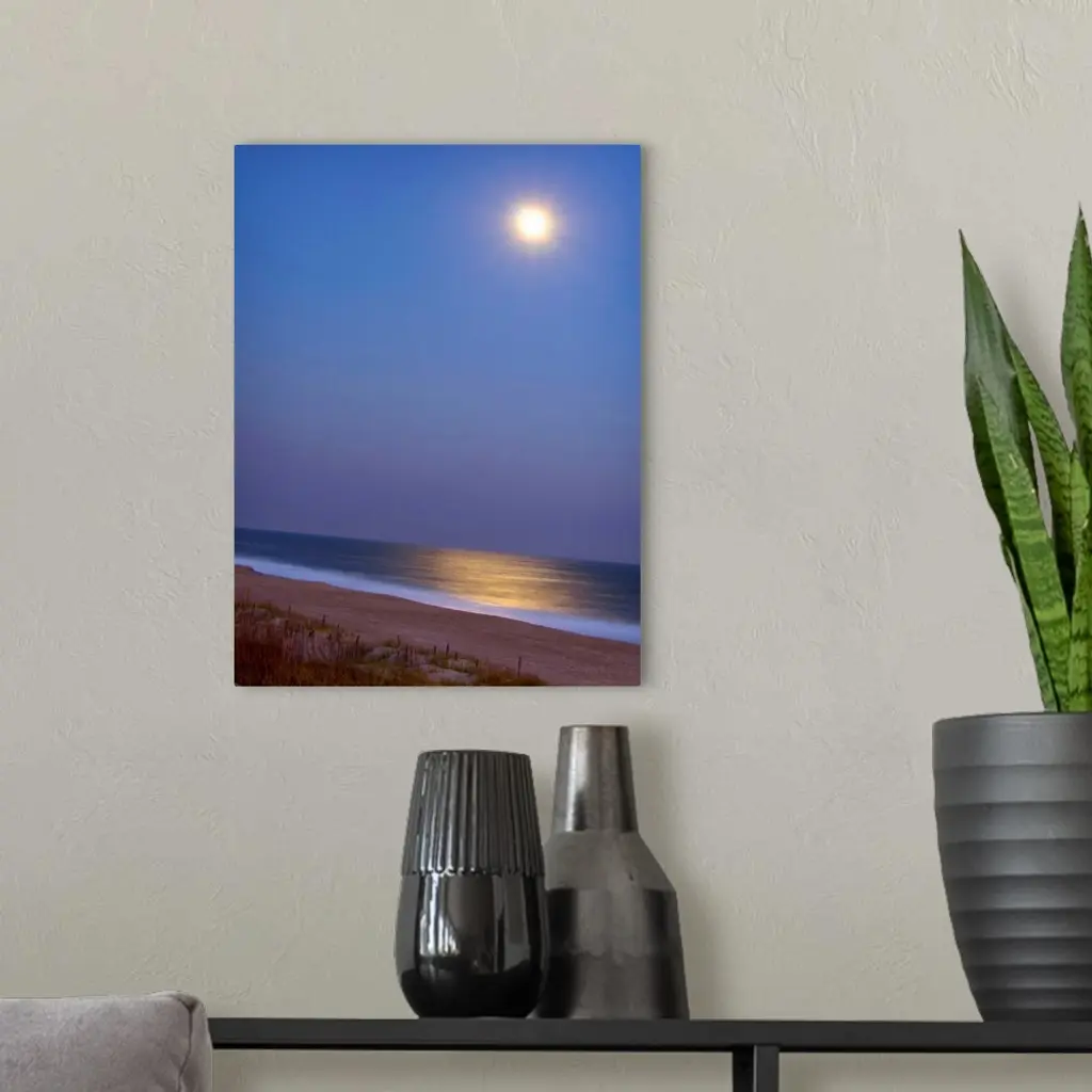 This large piece is a picture of the moon shining brightly over the beach and reflecting in the ocean.